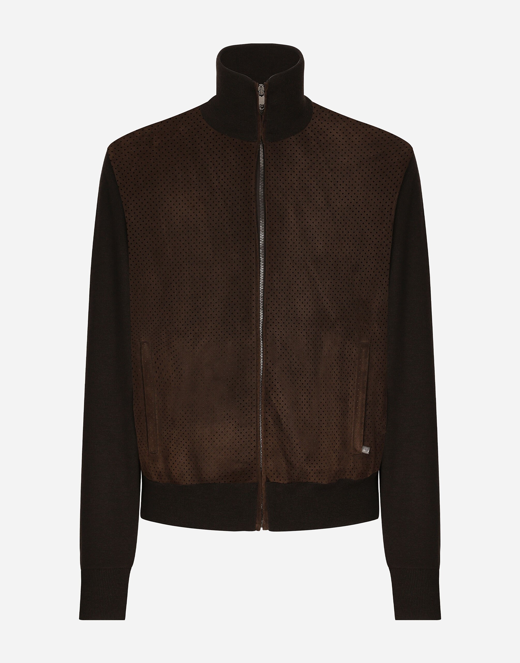 The Palermo collection represents the link between the Sicilian man’s world and the unspoiled nature of the island. A language marked by warm hues – sand, cream, Nero Sicilia black – floral paintings and iconic prints. The Dolce&Gabbana closet must-haves have been reworked in different materials, in pursuit of a new form of harmony. A collection rich in suggestion, such as the stripes inspired by the old mattresses of the 1940s and 1950s, and the timeless aesthetic of the looks. High-necked leather and wool jacket: • Brown • Regular fit • Long sleeves • Zipper fastening • Leather body • 14-gauge plain knit • The piece measures 68 cm from the shoulder seam on a size IT 50 • Made in Italy External composition: 65% Virgin Wool 35% Sheepskin