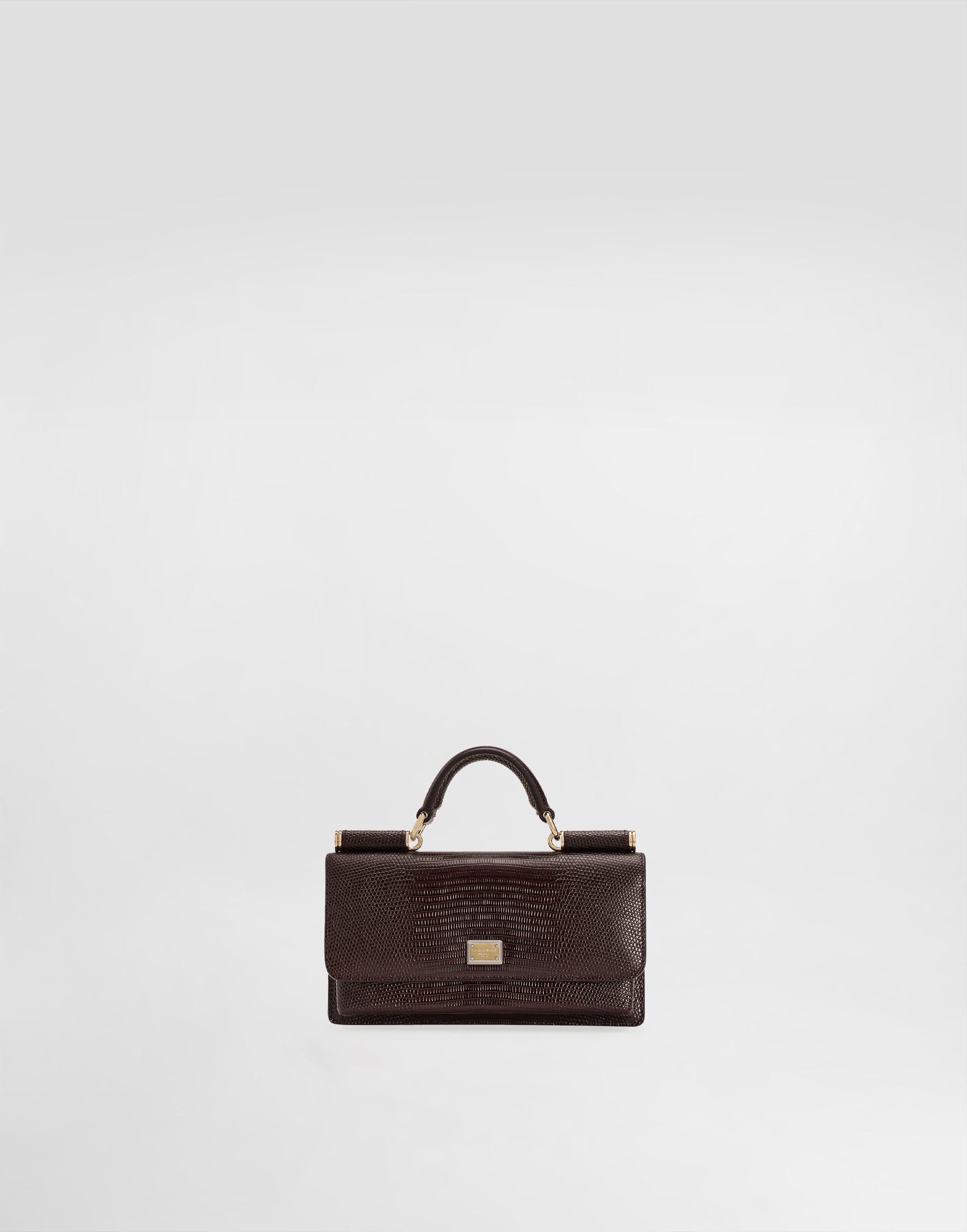 The accessories collection is getting a new function. Practical and versatile, this mini bag comes in iguana-print calfskin with the logo tag featuring two metal plating finishes. Iguana-print calfskin mini bag: • Burgundy • Front flap with hidden magnetic fastening • Logo tag featuring two metal plating finishes • Top handle and detachable chain strap • Iguana-print calfskin lining • Zipped inner pocket with branded slider and four card slots • Item comes with a branded dust bag • Measurements: H11 x L20 x D3 cm • Made in Italy External composition: 100% Calfskin Internal composition: 95% Calfskin 5% Viscose
