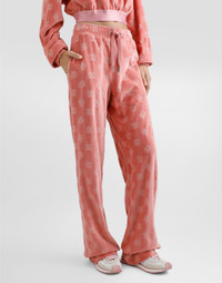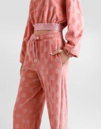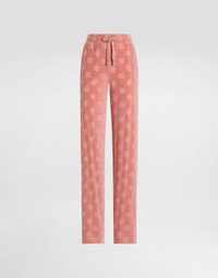 The Women’s DNA Collection is introducing a new side to femininity, which comes in shades of rose quartz, poised between sheerness and opacity, lightness and structure, formality and sensuality. Geometric Dolce Jackets, jacquard pajamas and floral brocade dresses intertwine with ultra-romantic designs. The DG print becomes an iconic statement, while Cordonetto lace and hints of Sicily Black embody the essence of a determined yet romantic femininity. Cotton chenille jogging pants with jacquard DG logo: • Pink • High stretch waist with drawstring • Pockets • Inner leg: 84 cm • Hem: 26 cm • The model is 175 cm tall and wears a size IT 40 • Made in Italy External composition: 100% Cotton