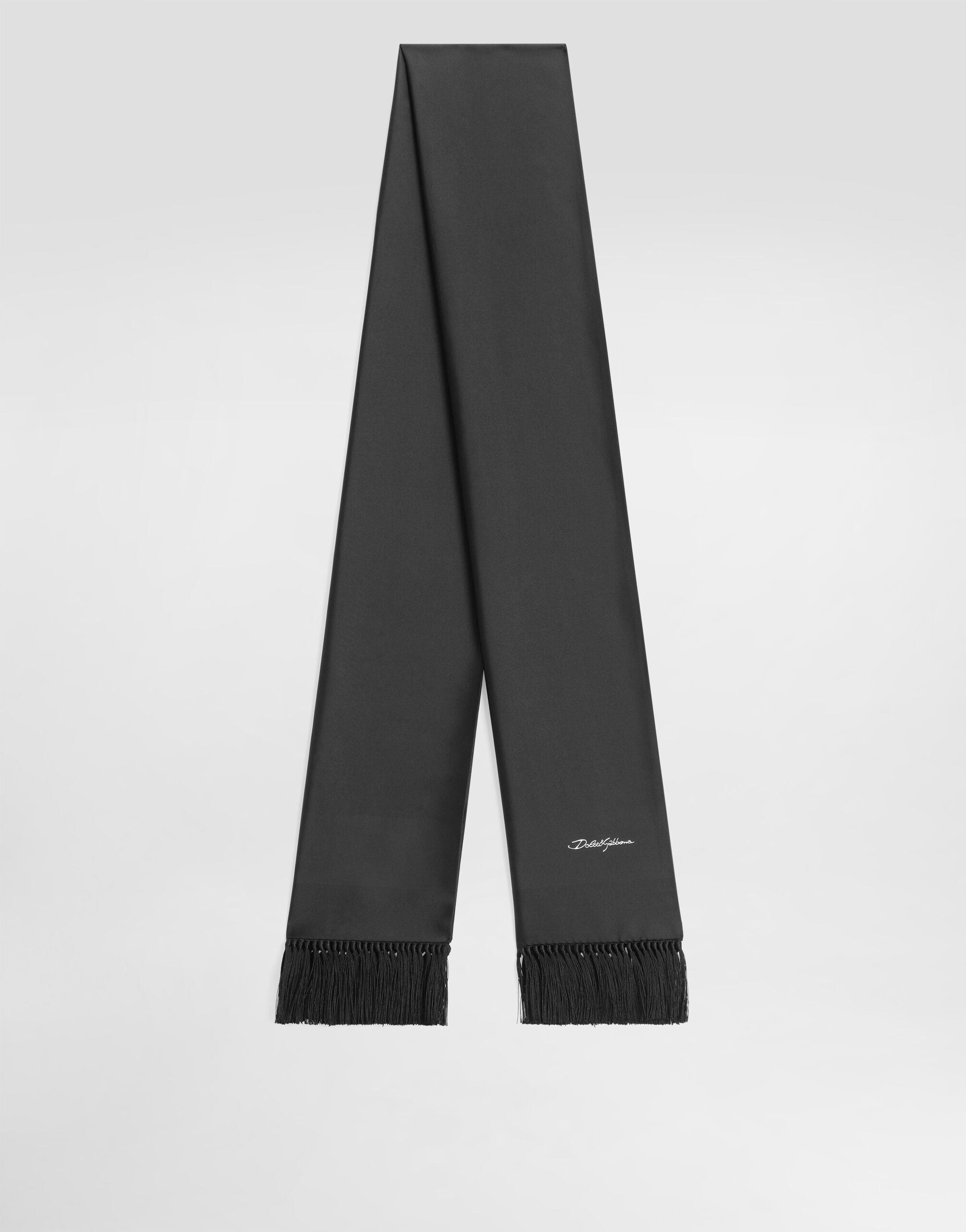The scene is set for Dolce&Gabbana's distinctive and iconic aesthetic codes in the Collection from Men's Fall/Winter 2025 Fashion Show. The evening lights up with radiant brooches and is enriched with classic suits and blazers of timeless elegance. This jacquard satin scarf is an essential accessory to enrich your look with a touch of elegance and sophistication. Jacquard satin scarf: • Black • Made in Italy External Composition: 100% Silk