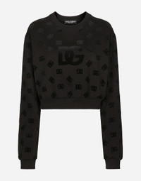 The DNA collection is distinguished by timeless shapes, bringing together three concepts: Sicilian flair, tailoring and sensuality. Nero Sicilia black and optical white predominate and pair with colors that catapult us onto the island of Sicily and make us dream. The designers channel the timeless wardrobe made up of creations that are instantly unmistakable in their simplicity, presenting us with sophisticated beauty loaded with meaning and symbolism that transcends fashion. Cotton jersey sweatshirt with all-over flocked DG logo print: • Black • Round neck • Long sleeves • Ribbed neck and cuffs • Cropped fit • The piece measures 44 cm from the center back on a size IT 40 • The model is 175 cm tall and wears a size IT 40 • Made in Italy External composition: 100% Cotton
