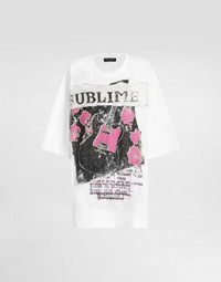 In the Fall/Winter 2025 Fashion Show Collection, shearling jackets, in fur-free versions, reveal slip dresses and create contrast' plays while denim welcomes fabric or Leo print inserts. Sweatshirts are the result of long experimentation with volumes. Evening looks become precious thanks to dresses with special embroideries and luminous touches of sequins and crystals. Sheepskin inserts also unite hats, shoes, and bags, including those with pockets. This printed jersey t-shirt is an essential piece to add a touch of modern and casual style to your wardrobe. Perfect for any occasion, it stands out for its versatility and comfort. Jersey t-shirt with print: • Multi-colored • Crew neck • Short sleeves • Riveted center back cut • Ribbed collar • The model is 175 cm tall and wears size 40 IT • Made in Italy External Composition: 100% Cotton