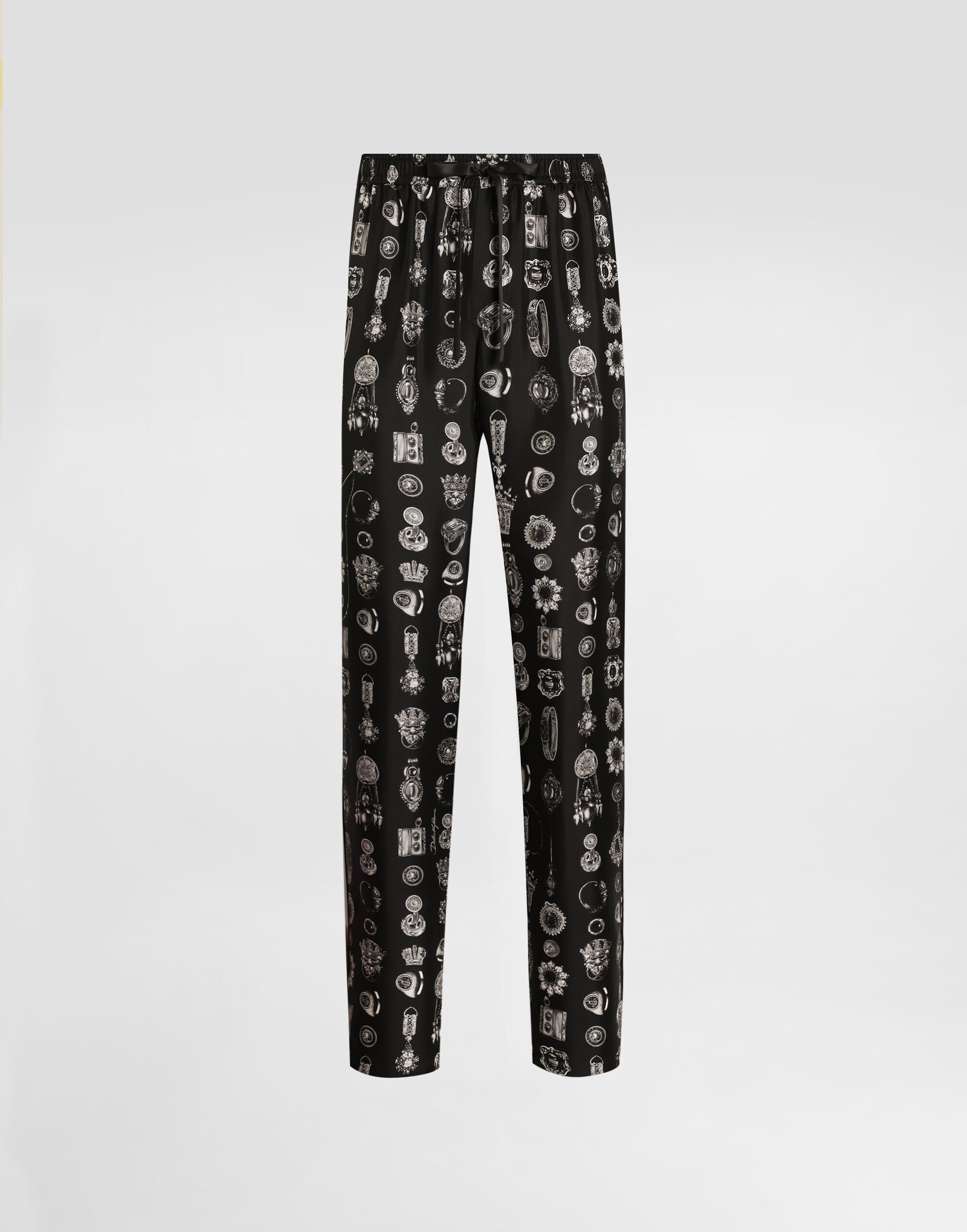 These pajama pants are perfect for those looking for comfort without sacrificing style. With refined details such as side piping and jewel print, they are ideal for a casual yet refined look. Jewel-print twill trousers: • Multi-colored • French pockets • Right back pocket • Elastic waistband and drawstring loops • Faux lacing with stitching for flap • The model is 185 cm tall and wears a size 48 IT • Made in Italy The difference in the print placement that you may find on this product is a feature of Dolce&Gabbana’s “Handmade” pieces. A detail that makes every garment or accessory unique and exclusive. External Composition: 100% Silk
