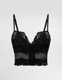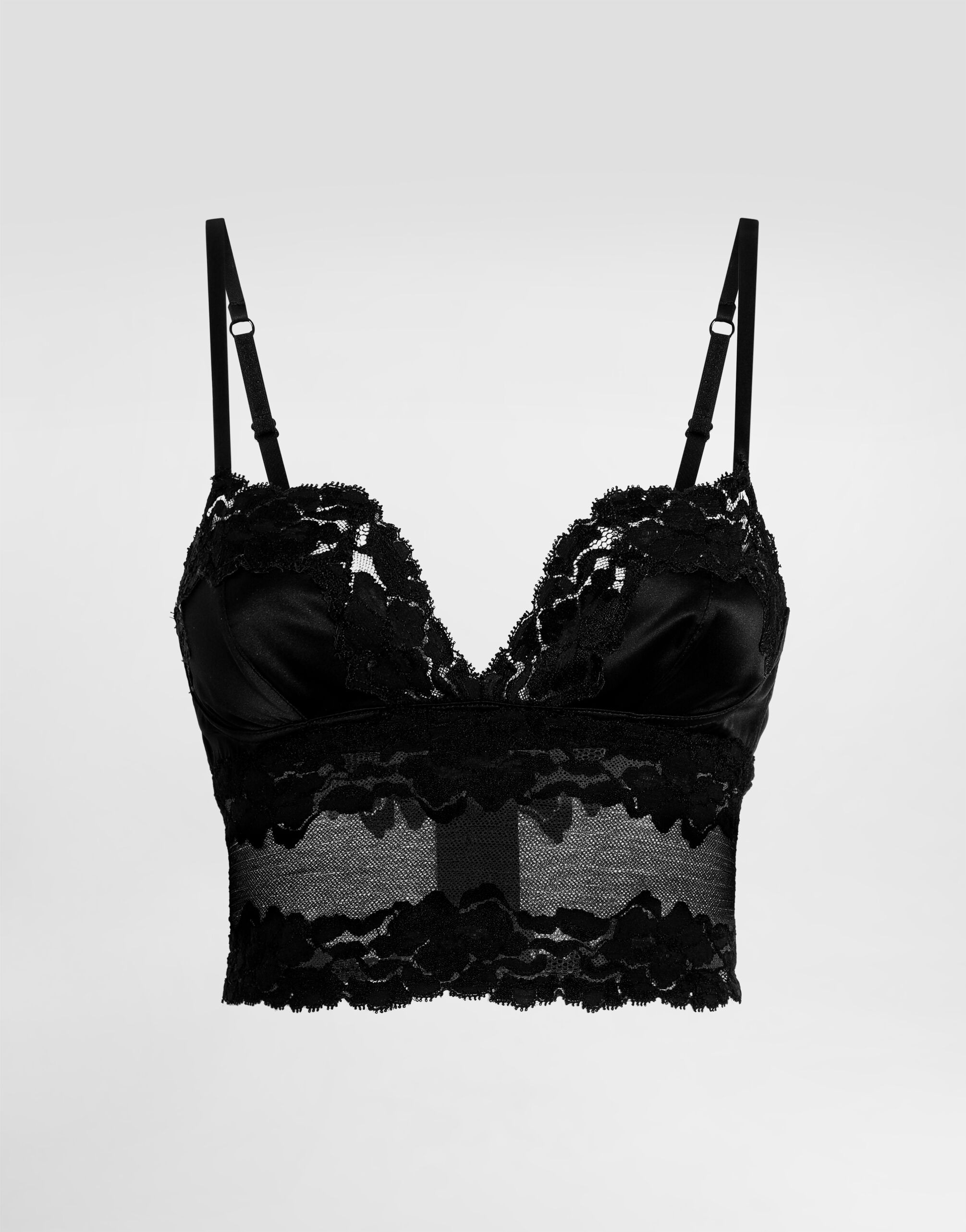 In the Fall/Winter 2025 Fashion Show Collection, shearling jackets, in fur-free versions, reveal slip dresses and create contrast' plays while denim welcomes fabric or Leo print inserts. Sweatshirts are the result of long experimentation with volumes. Evening looks become precious thanks to dresses with special embroideries and luminous touches of sequins and crystals. Sheepskin inserts also unite hats, shoes, and bags, including those with pockets. This lace and satin bra top represents the perfect balance between elegance and sensuality, ideal for a sophisticated and feminine look. Lace and satin bra top: • Black • Made in Italy External Composition: 63% Polyamide, 32% Silk, 5% Elastane Internal Composition: 94% Silk, 6% Elastane