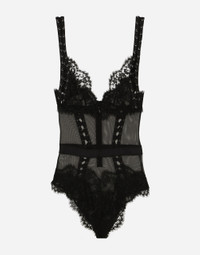 The lingerie collection is a mix of elegant and sensual pieces in fine, sophisticated materials that flaunt timeless and ageless feminine allure, the distinctive, unmistakable feature of the Dolce&Gabbana woman. Lace bodysuit with lacing and eyelets: • Black • Zipper on the back • Hook-and-eye fastenings on the bottom • Made in Italy Given the product characteristics, unfortunately some items in the underwear category cannot be returned. For more information, please consult the Returns and Refunds section. External composition: 45% Viscose 24% Cotton 24% Polyamide 7% Silk