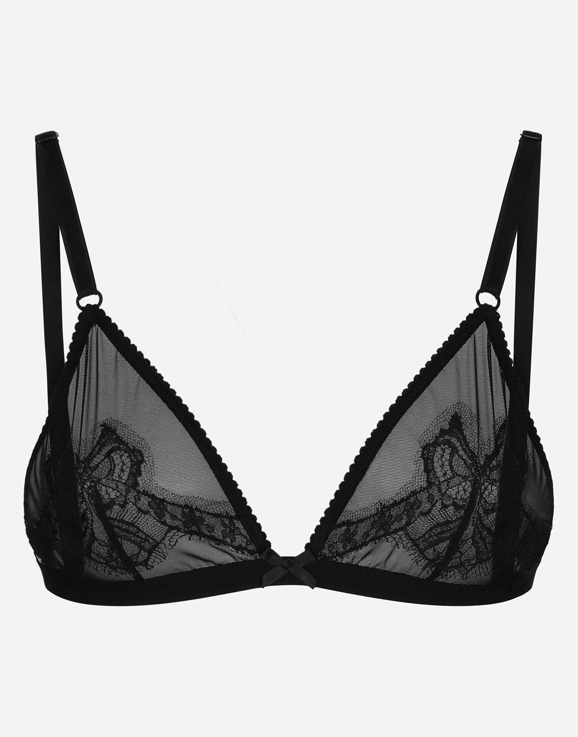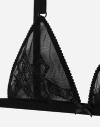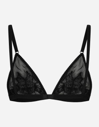 Menswear and womenswear mix and mingle, influencing one another and creating tailoring that embraces endless nuances, from the boldest to the most sophisticated, to define the rules of eternally classy femininity. A monochrome retelling in Nero Sicilia black, embellished by golden touches and rhinestones, adorning clean lines and incorporating stylish fabrics such as velvet, chiffon, lace, organza, and unique mesh details, the expression of authentic beauty for dresses, shirts and accessories. Tulle soft-cup triangle bra with lace inlay: • Black • Lace inserts • Adjustable stretch straps • Adjustable hook-and-bar fastenings on the center back • Made in Italy External composition: 77% Polyamide 16% Viscose 7% Spandex