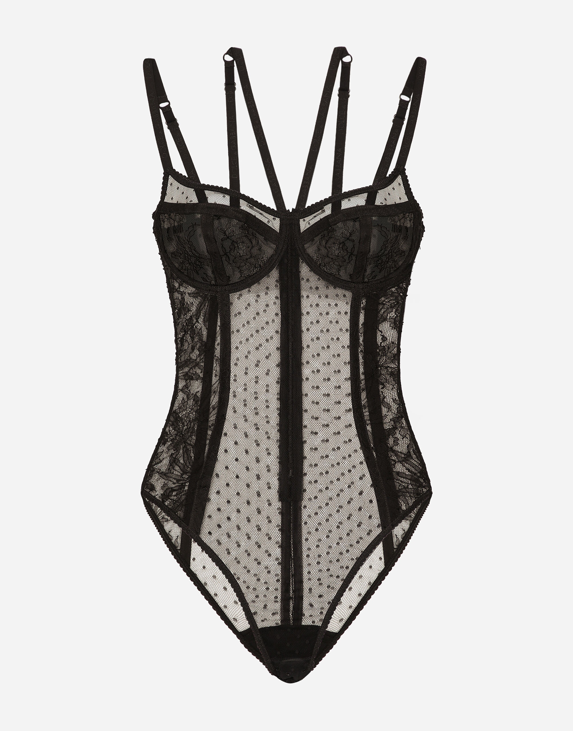 The lingerie collection is a mix of elegant and sensual pieces in fine, sophisticated materials that flaunt timeless and ageless feminine allure, the distinctive, unmistakable feature of the Dolce&Gabbana woman. Lace lingerie-style bodysuit: • Black • Unlined • Underwired cups • Adjustable straps • Boning • Zipper on the back and hook-and-eye fastenings on the gusset • The model is 175 cm tall and wears a size IT 40 • Made in Italy Given the product characteristics, unfortunately some items in the underwear category cannot be returned. For more information, please consult the Returns and Refunds section. External composition: 70% Polyamide 30% Viscose