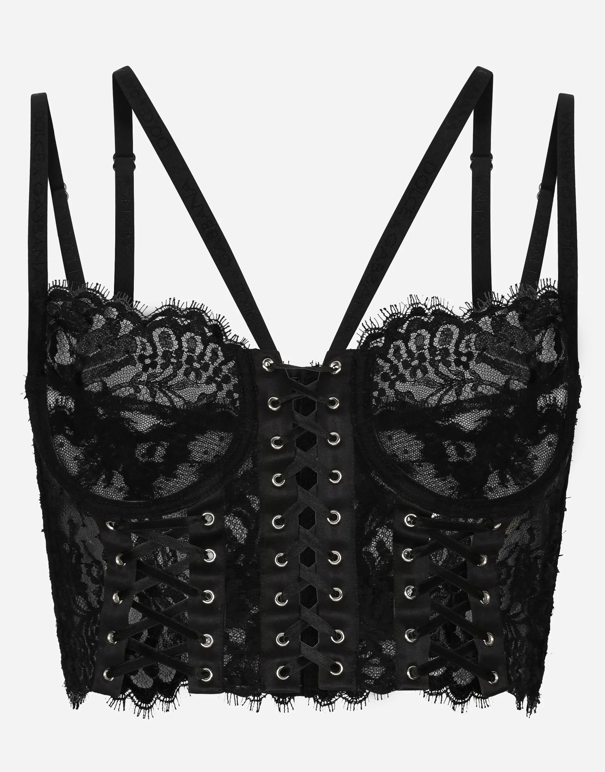Lace lingerie corset with double straps and eyelets and lacing: • Black • Unlined • Thin adjustable double straps • Hook-and-eye fastenings on the back • The model is 175 cm tall and wears a size IT 40 • Made in Italy Care And Details External composition: 50% Polyamide 25% Viscose 20% Cotton 5% Silk
