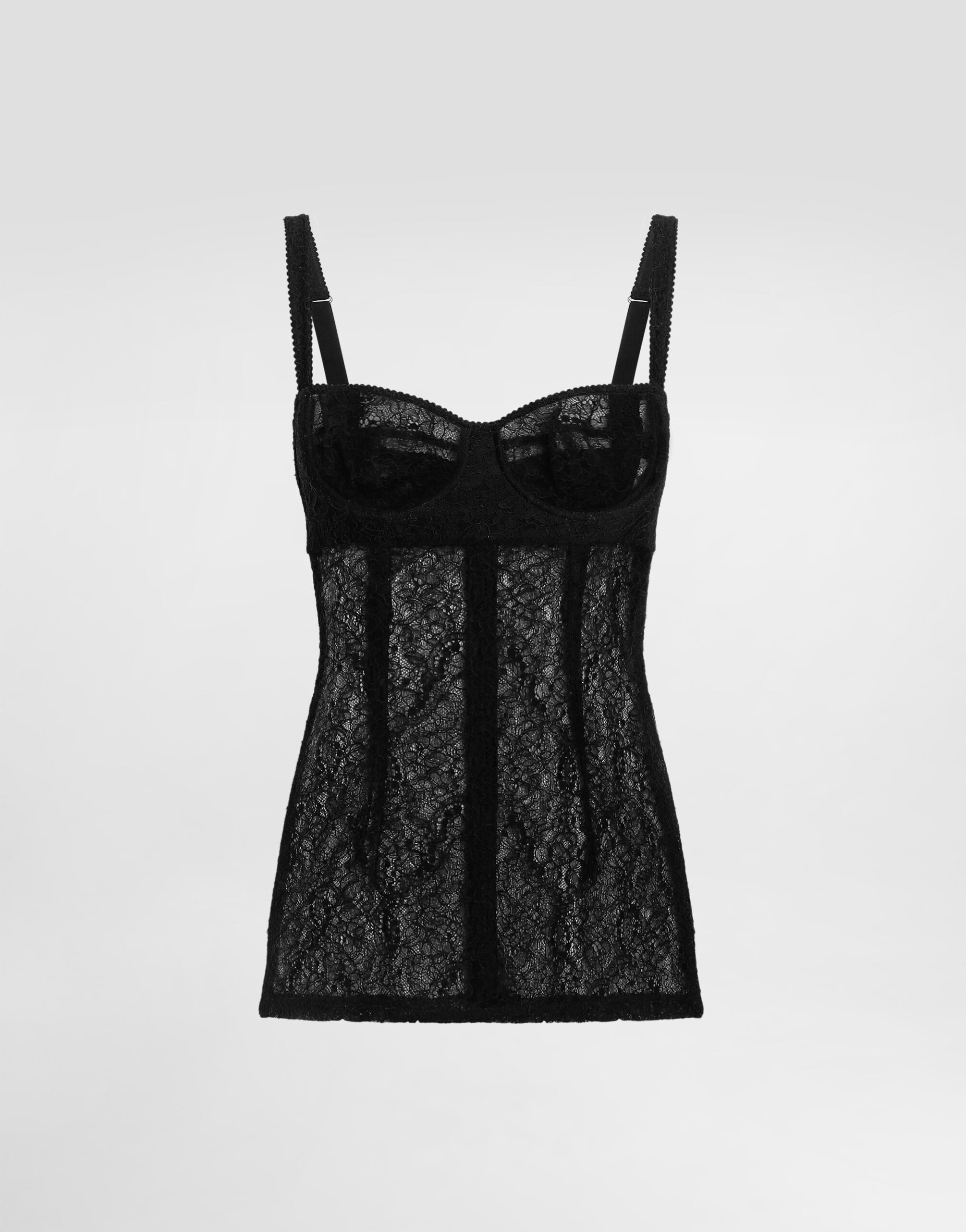 This fitted lace top is an example of modern elegance, perfect for adding a sophisticated touch to any outfit. Lace top with underbust cut: • Black • Bra-like bodice • Adjustable straps • Opening at the center back with invisible zip, hook and buttonhole • Length from shoulder point 40 cm on size 40 IT • The model is 175 cm tall and wears size 40 IT • Made in Italy External Composition: 86% Polyamide, 14% Elastane Internal Composition: 65% Silk, 28% Polyamide, 7% Elastane