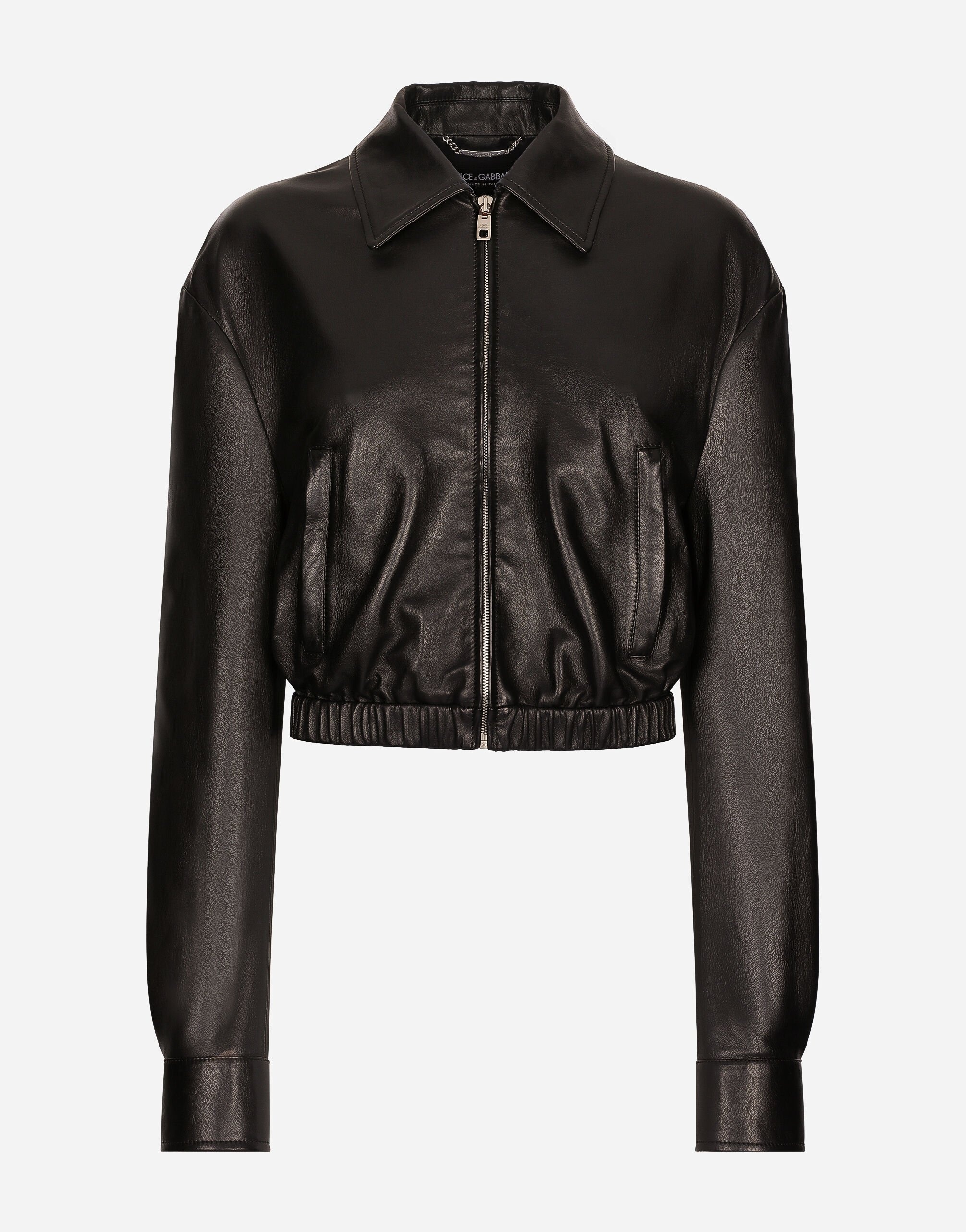 The DNA collection is distinguished by timeless shapes, bringing together three concepts: Sicilian flair, tailoring and sensuality. Nero Sicilia black and optical White predominate and pair with colors that catapult us onto the island of Sicily and make us dream. The designers channel the timeless wardrobe made up of creations that are instantly unmistakable in their simplicity, presenting us with sophisticated beauty loaded with meaning and symbolism that transcends fashion. Lambskin bomber jacket: • Black • Shirt collar with double crescent detail • Shirt-style sleeves with pleated cuffs and press-stud buttons • Stretch hem • Welt pockets • Logo tag on upper center back • Stretch silk satin lining • Front zipper fastening • The piece measures 45 cm from the center back on a size IT 40 • The model is 175 cm tall and wears a size IT 40 • Made in Italy External composition: 100% Lambskin Internal composition: 92% Silk 8% Spandex
