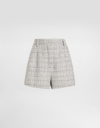 The Everyday Women's Collection reimagines contemporary daily wear with Dolce&Gabbana's signature style codes. Iconic fabrics mix with standout details like embroidered flowers, crystals, and jewel buttons, infusing elegance into every look. Gray animal print accented with green and purple, hyper-geometric jewelry, voluminous shapes and transparencies add unique touches. Men's tweed is reinvented with graphic twists, creating distinctive pieces that reflect refined sensuality. Lame tweed boucle shorts: • Gray • High-waisted • Slant pockets • Belt loops • Inner leg: 6 cm • Hem: 34 cm • Zipper and button fastening with DG logo • The model is 175 cm tall and wears a size IT 40 • Made in Italy External composition: 25% Viscose 18% Cotton 18% Polyamide 16% Polyester 12% Acrylic 06% Linen 05% Metallic Polyester Internal composition: 92% Silk 8% Spandex