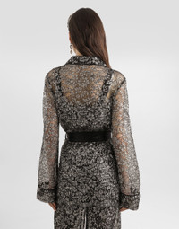 Elegance, tailored lines and sparkling details define the Dolce&Gabbana Holiday collection. Sixties inspirations blend with a contemporary aesthetic. For him, structured jackets and cuts that enhance the silhouette for her, silver brocade and crystals illuminate festive looks. Each piece stands out for its fine materials, attention to detail and distinctive style. This lame lace vanity shirt is a stylish and sophisticated piece that is perfect for adding a precious touch to your wardrobe. With refined details such as the lapel collar and the knotted belt at the waist, it is ideal for those looking for a distinctive and refined style. Lame lace vanity shirt: • Silver • Lapel collar with spear tip • Patch pockets on the front • Self-tie belt at waist • Long sleeves with cuff edge • Length from shoulder is 75 cm on size 40 IT • Made in Italy External composition: 28% Metallic Polyester, 20% Silk, 18% Polyamide, 17% Cotton, 17% Viscose