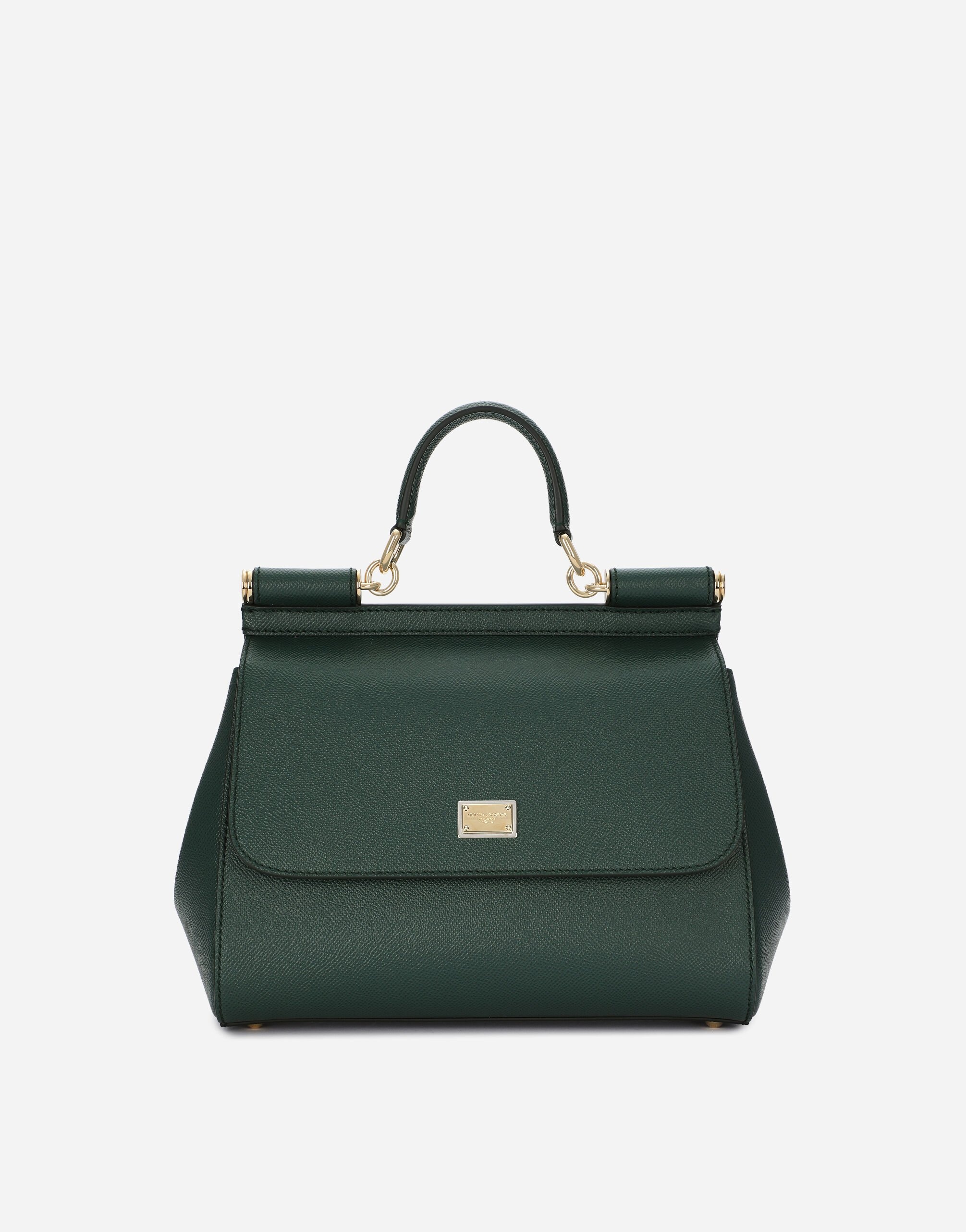 The brand icon par excellence; this large Sicily bag comes in Dauphine calfskin. Understated and feminine; it comes with the logo tag featuring two metal plating finishes. Large handbag from the Sicily line in Dauphine leather. • Front flap with hidden snap closure and galvanic logo plate in the front • Top handle and adjustable and removable leather shoulder strap • Cotton interior with Leo print • Internal zip pocket and smartphone pocket • Metal studs on the bottom • Comes with logoed Dust Bag • Measurements. 026 x 21 x 12 cm • Made in Italy External Composition: 100% Calfskin Internal Composition: 80% Cotton 20% Calfskin
