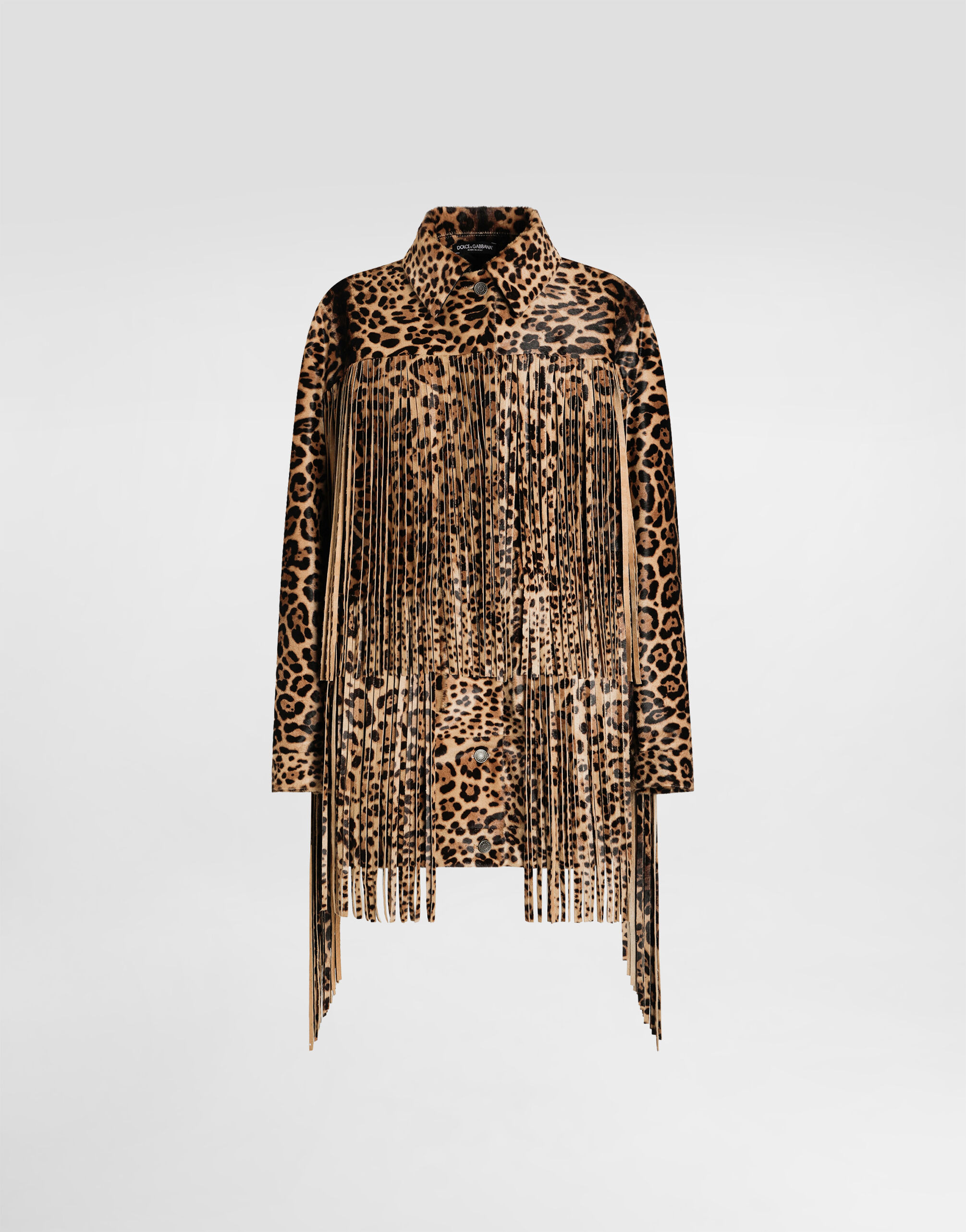 In the Fall/Winter 2025 Fashion Show Collection, shearling jackets, in fur-free versions, reveal slip dresses and create contrast' plays while denim welcomes fabric or Leo print inserts. Sweatshirts are the result of long experimentation with volumes. Evening looks become precious thanks to dresses with special embroideries and luminous touches of sequins and crystals. Sheepskin inserts also unite hats, shoes, and bags, including those with pockets. This jacket is a bold and trendy piece that is ideal for those who like to stand out in style. The fringes and Leopard-print add a wild and sophisticated touch, perfect for an urban and contemporary look. Leopard-print fringed jacket: • Multi-colored • Sleeves with slit • Patch pocket at the waist with flap • Buttonhole and button fastening • Lined with quilted lining for body and sleeves • The model is 175 cm tall and wears size 40 IT • Made in Italy The difference in the print placement that you may find on this product is a feature of Dolce&Gabbana’s “Handmade” pieces. A detail that makes every garment or accessory unique and exclusive. External Composition: 90% Calf, 10% Lamb Internal Composition: 100% Silk