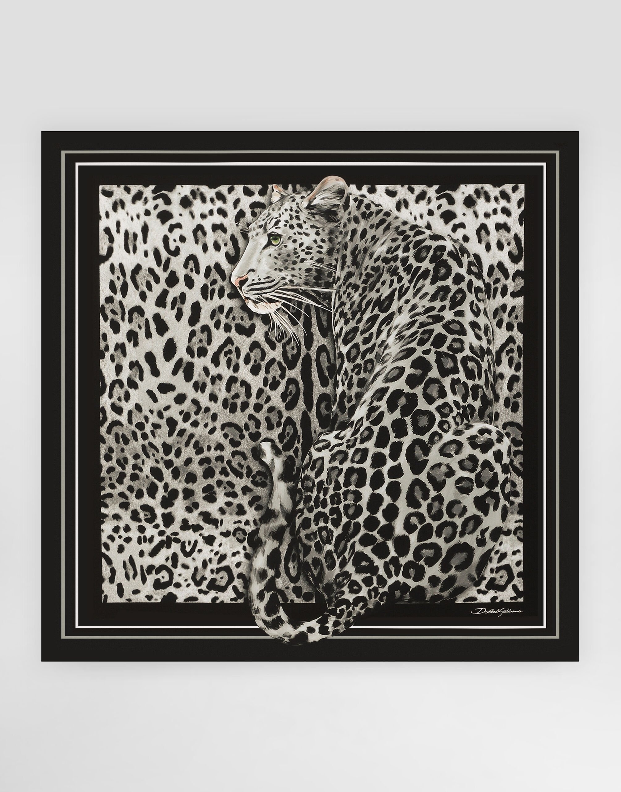 The Everyday Women's Collection reimagines contemporary daily wear with Dolce&Gabbana's signature style codes. Iconic fabrics mix with standout details like embroidered flowers, crystals, and jewel buttons, infusing elegance into every look. Gray animal print accented with green and purple, hyper-geometric jewelry, voluminous shapes and transparencies add unique touches. Men's tweed is reinvented with graphic twists, creating distinctive pieces that reflect refined sensuality. Leopard-print silk twill foulard: • Leopard print • Hand-sewn hem • “Dolce&Gabbana” logo • Measurements: 90 x 90 cm • Made in Italy The difference in the print placement that you may find on this product is a feature of Dolce&Gabbana’s “Handmade” pieces. A detail that makes every garment or accessory unique and exclusive. External composition: 100% Silk