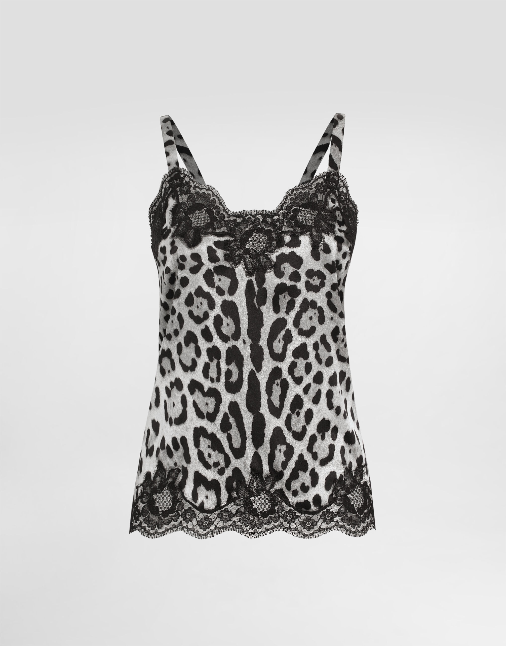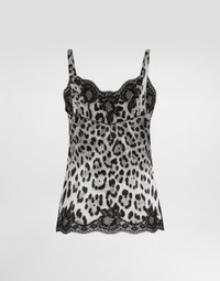 The Everyday Women's Collection reimagines contemporary daily wear with Dolce&Gabbana's signature style codes. Iconic fabrics mix with standout details like embroidered flowers, crystals, and jewel buttons, infusing elegance into every look. Gray animal print accented with green and purple, hyper-geometric jewelry, voluminous shapes and transparencies add unique touches. Men's tweed is reinvented with graphic twists, creating distinctive pieces that reflect refined sensuality. Stretch silk satin lingerie-style top with leopard print and lace detailing: • Leopard print • Sweetheart neckline • Adjustable straps • Unlined • The piece measures 60 cm from the strap on an IT size 2 • Made in Italy The difference in the print placement that you may find on this product is a feature of Dolce&Gabbana’s “Handmade” pieces. A detail that makes every garment or accessory unique and exclusive. External composition: 84% Silk 8% Cotton 6% Spandex 2% Polyamide