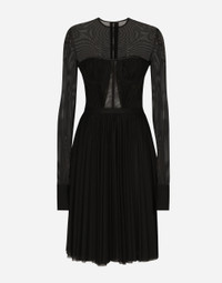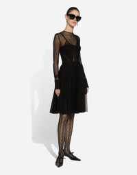 Inspired by 80s fashion photography, the Black Sicily collection masterfully blends masculine and feminine elements, pairing tailored cuts and corset details for the FW 24/25 season. A new vision of the iconic Nero Sicilia black is conveyed through contemporary and sensual looks: jackets and skirts in all-over glen plaid pair with openwork socks, while the 50s-inspired Mun shoes with Eva heel go with the houndstooth Sicily bag featuring crocodile-print leather inserts. Light stretch tulle dress with corset details: • Black • Round neck • Long sleeves • Underwired cups • Tulle lining • Rear zipper and hook-and-eye fastening • The piece measures 60 cm from the waist down on a size IT 40 • The model is 175 cm tall and wears a size IT 40 • Made in Italy External composition: 70% Polyamide 16% Spandex 7% Acetate 7% Viscose Internal composition: 74% Polyamide 17% Spandex 9% Silk