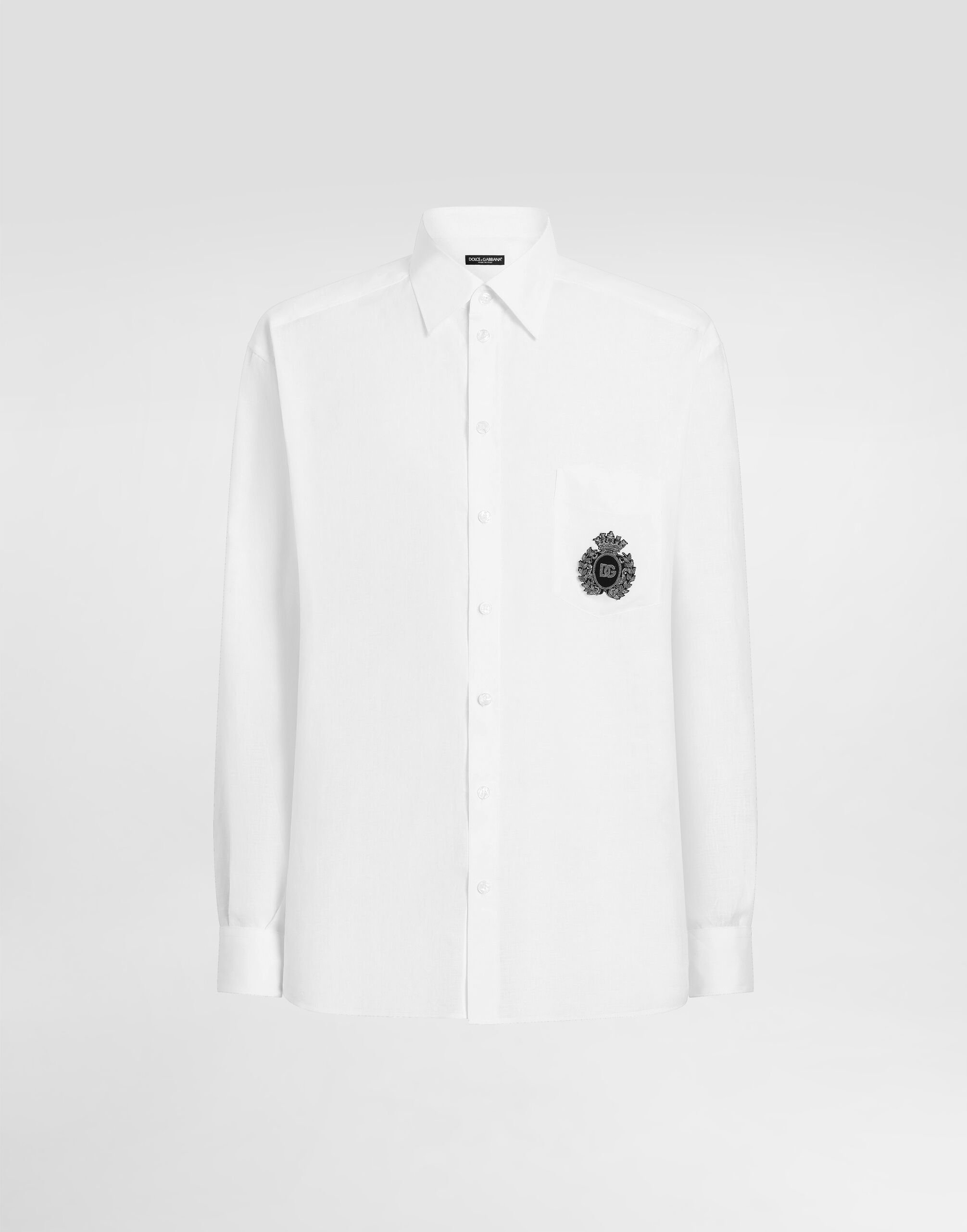 The Italian Holiday Men's Collection revisits 1950s style with a blend of relaxed fits and modern flair. Classic white shirts and tailored suits in refined fabrics contrast with casual denim and playful T-shirts featuring retro graphics with a futuristic twist. Bold prints—chessboards, cats, elegant lighters, and Mediterranean blue ribbons—alongside logo jacquard inspired by ties, infuse a contemporary edge into the essence of Italian holidays. Oversize linen shirt with heraldic patch: • White • Oversize fit • Kent collar • Long sleeves • Button fastenings and breast pocket • The piece measures 78 cm from the rear collar seam on a size IT 40 • Made in Italy External composition: 100% Linen