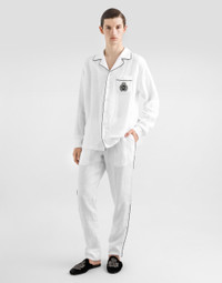 The Italian Holiday Men's Collection revisits 1950s style with a blend of relaxed fits and modern flair. Classic white shirts and tailored suits in refined fabrics contrast with casual denim and playful T-shirts featuring retro graphics with a futuristic twist. Bold prints—chessboards, cats, elegant lighters, and Mediterranean blue ribbons—alongside logo jacquard inspired by ties, infuse a contemporary edge into the essence of Italian holidays. Non-stretch linen vanity shirt with DG logo embroidery: • White • Loose fit • Notched lapels • Button fastenings • Long sleeves • Patch breast pocket • Contrasting piping • The piece measures 78 cm from the rear collar seam on a size IT 40 • Made in Italy External composition: 98% Linen 2% Silk