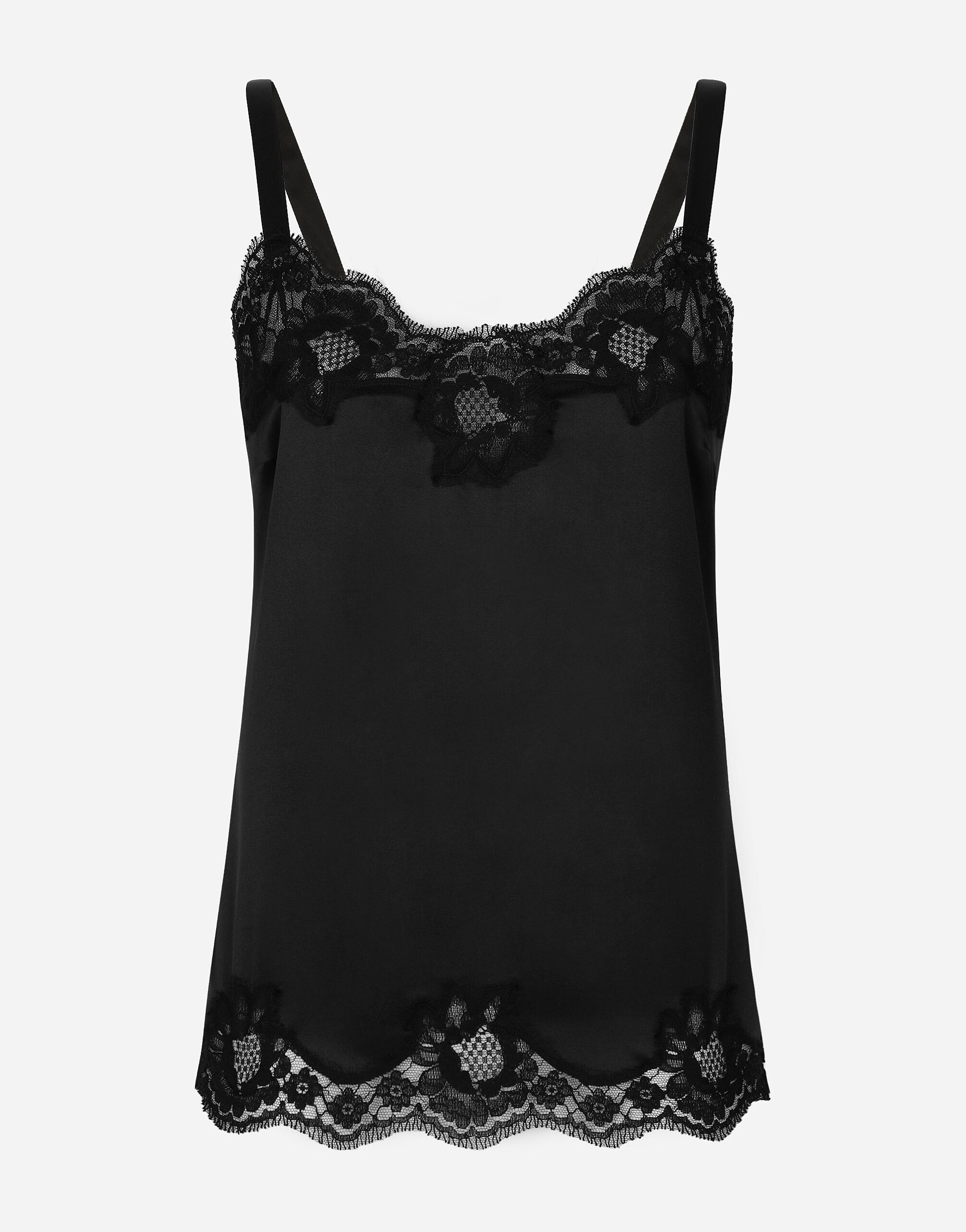 Tailoring; versatility and excellence have always been the essence of the Dolce&Gabbana collections and come to life on feminine and timeless garments and accessories. Lingerie top in stretch silk satin • Heart shaped neckline and hem with inserts in cotton lace • Shoulder straps in silk satin • Garment length 60 cm - 23.6 inches (from the shoulder strap in size 2) • Made in Italy Composition: 80% Silk; 12% Cotton; 5% Elastane; 3% Nylon