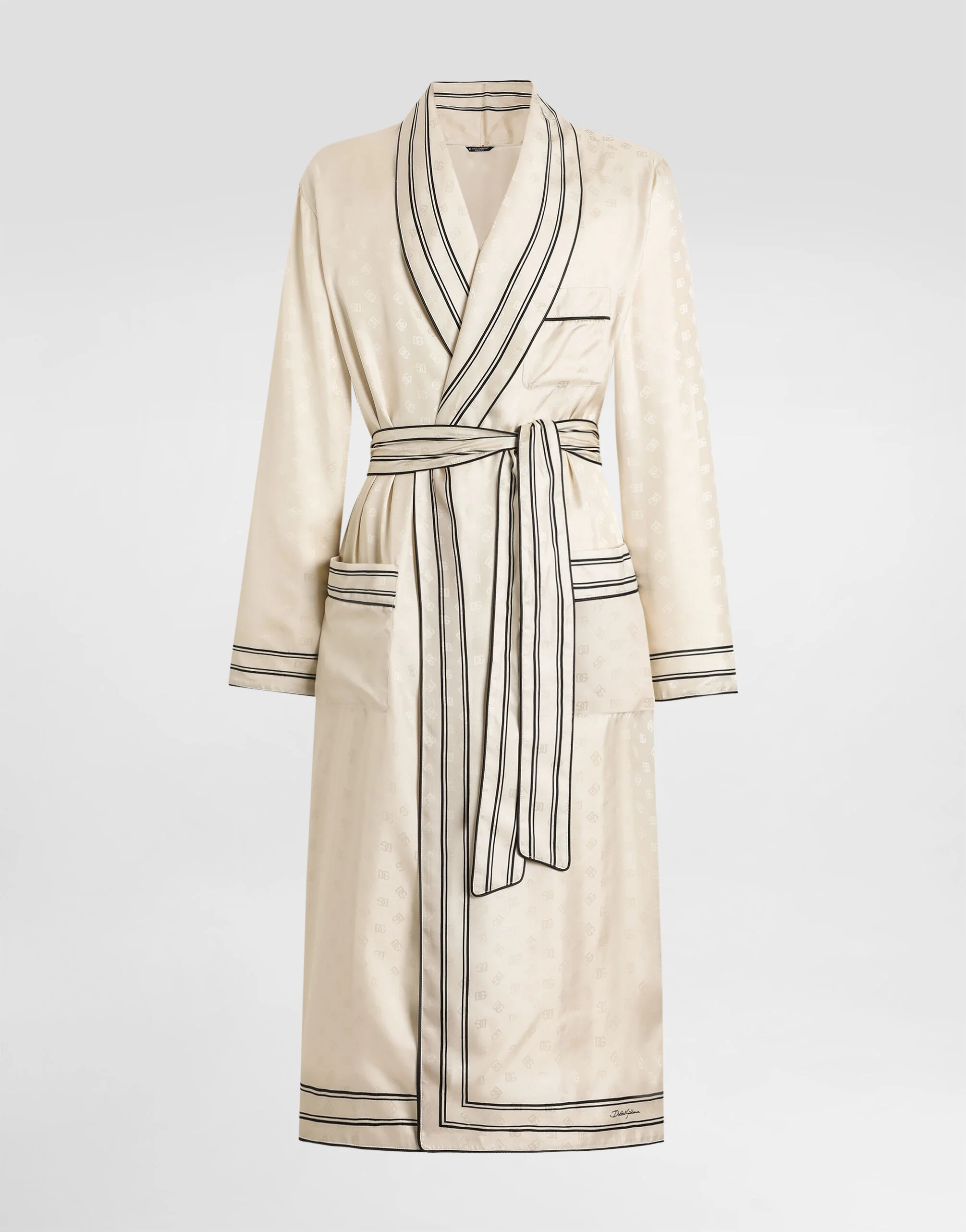 This silk dressing gown is the epitome of elegance, perfect for the man who doesn't give up style even in moments of relaxation. Logo and stripe-print twill robe: • Multi-colored • Shawl collar • With piping • Lined • Center back length 130 cm on size 48 IT • The model is 185 cm tall and wears a size 48 IT • Made in Italy The difference in the print placement that you may find on this product is a feature of Dolce&Gabbana’s “Handmade” pieces. A detail that makes every garment or accessory unique and exclusive. External Composition: 100% Silk Internal Composition: 100% Silk