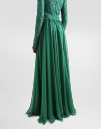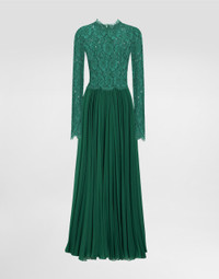 The Everyday Women's Collection reimagines contemporary daily wear with Dolce&Gabbana's signature style codes. Iconic fabrics mix with standout details like embroidered flowers, crystals, and jewel buttons, infusing elegance into every look. Gray animal print accented with green and purple, hyper-geometric jewelry, voluminous shapes and transparencies add unique touches. Men's tweed is reinvented with graphic twists, creating distinctive pieces that reflect refined sensuality. Long floral cordonetto lace and silk chiffon dress: • Green • Round neck • Long sleeves • Stretch silk crepe de chine slip dress • Rear zipper and hook-and-bar fastening • The piece measures 120 cm from the waist down on a size IT 40 • The model is 175 cm tall and wears a size IT 40 • Made in Italy External composition: 70% Silk 15% Viscose 08% Cotton 07% Polyamide Internal composition: 91% Silk 09% Spandex