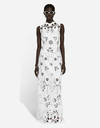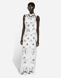 The Italian summers of the 1960s, the candid purity of white, the sophisticated elegance of the jet set of that era. The imagery of the FW24/25 Capri Collection encapsulates all this flawlessly. The pieces range from floaty poplin silhouettes or sack-style dresses and skirts, to brocade outerwear and floral-inlay fabric shirts. The iconic bags – the Logo Bag, the Sicily Bag and the Dolce Box – complement the looks, while the shoes come embroidered with designs inspired by the crystal-clear sea of Capri. Long cotton poplin dress with cut-out detailing: • White • Round neck • Sleeveless • Unlined • Rear zipper and hook-and-eye fastening • The piece measures 147 cm from the center back on a size IT 40 • The model is 175 cm tall and wears a size IT 40 • Made in Italy External composition: 96% Cotton 04% Polyester