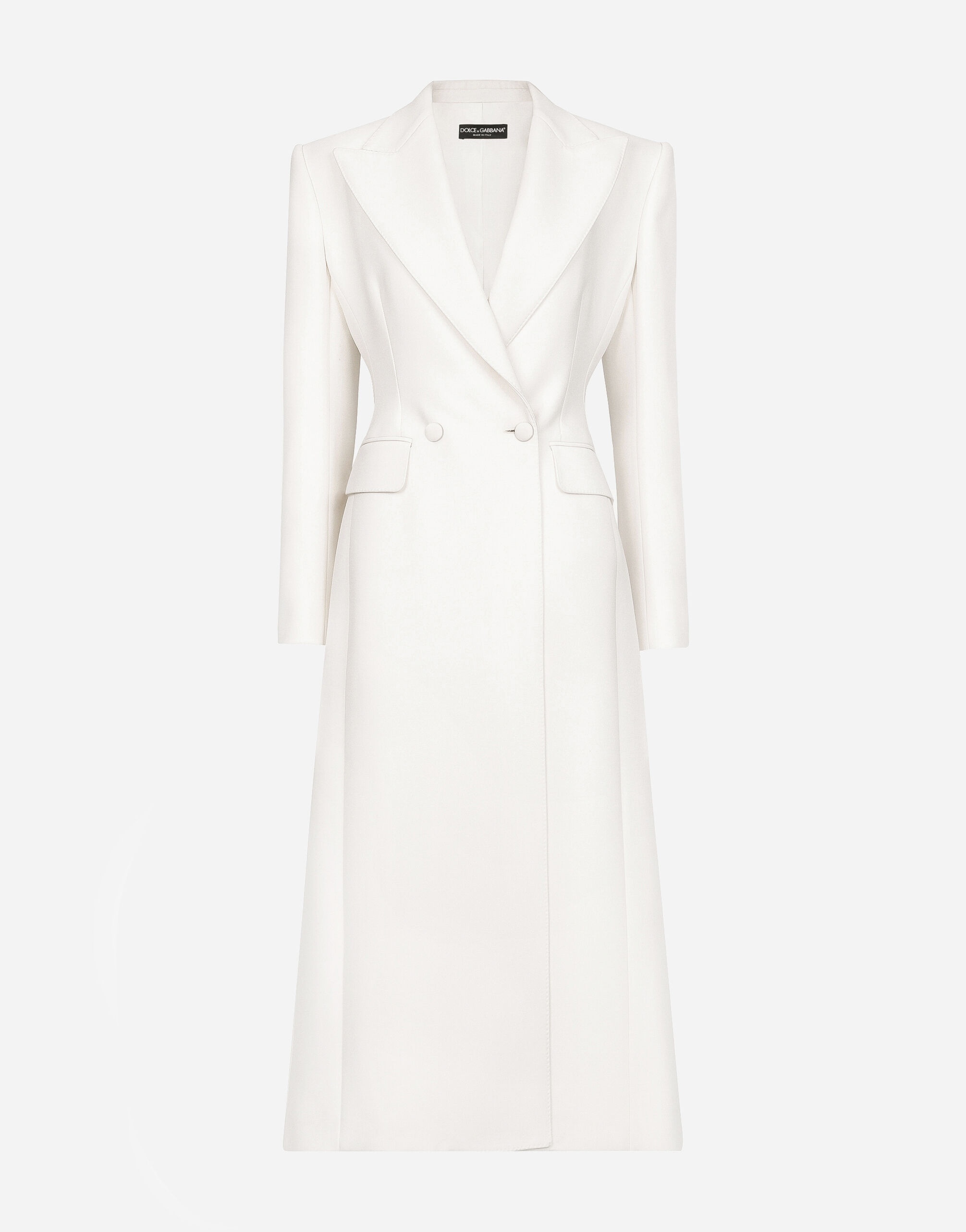 Long double-breasted wool cady coat: • White • Peak lapels • Long sleeves • Shoulder pads • Slim fit • Flap pockets • Stretch silk satin lining • Button fastenings • The piece measures 125 cm from the center back on a size IT 40 • The model is 175 cm tall and wears a size IT 40 • Made in Italy Care And Details External composition: 90% Virgin Wool 10% Polyamide Internal composition: 92% Silk 8% Spandex