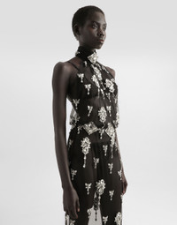 In the Fall/Winter 2025 Fashion Show Collection, shearling jackets, in fur-free versions, reveal slip dresses and create contrast' plays while denim welcomes fabric or Leo print inserts. Sweatshirts are the result of long experimentation with volumes. Evening looks become precious thanks to dresses with special embroideries and luminous touches of sequins and crystals. Sheepskin inserts also unite hats, shoes, and bags, including those with pockets. This suit is a sartorial work of art, perfect for those looking for elegance and sophistication. Made of tulle embroidered with rhinestones, it captures the light and attention on any special occasion. Long tulle dress embroidered with rhinestones: • Multi-colored • Embroidered bodice with bare shoulders and back • Draped collar with snap closure • Long flared skirt with light tail • Invisible zip on the back • The model is 175 cm tall and wears size 40 IT • Made in Italy External Composition: 100% Polyamide Internal Composition: 100% Polyamide
