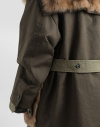 In the Fall/Winter 2025 Fashion Show Collection, shearling jackets, in fur-free versions, reveal slip dresses and create contrast' plays while denim welcomes fabric or Leo print inserts. Sweatshirts are the result of long experimentation with volumes. Evening looks become precious thanks to dresses with special embroideries and luminous touches of sequins and crystals. Sheepskin inserts also unite hats, shoes, and bags, including those with pockets. This long jacket is the perfect balance between functionality and style, ideal for the modern woman looking for a versatile and fashionable garment. With fur details and leather straps, this jacket is a must-have for those who like to stand out with class. Long jacket in resin-coated gabardine: •Green • With fur details applied on the yoke and front • Leather straps on the sides and sleeves • Concealed buttoning with buttonholes visible only at the top • Chest and waist pockets • Sleeves with slit at the bottom and elbow patches • Cuff motif with overlapping front • The model is 175 cm tall and wears size 40 IT • Made in Italy External Composition: 60% Cotton, 40% Lamb Internal Composition: 100% Silk