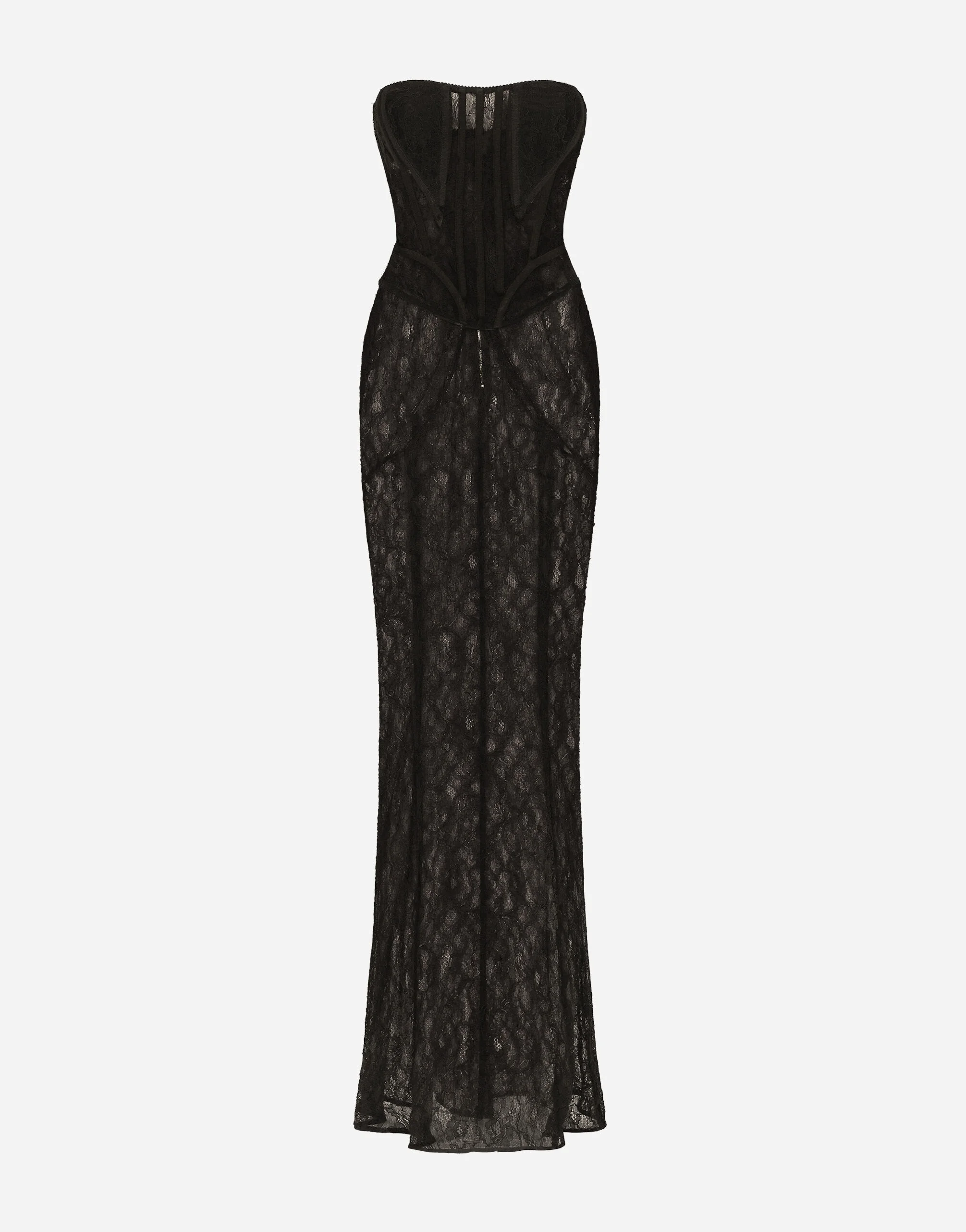 Long stretch lace corset dress: • Black • Strapless corset neckline • Boned bodice • Lined cups • Rear zipper and hook-and-eye fastening • The piece measures 120 cm from the waist down on a size IT 40 • The model is 175 cm tall and wears a size IT 40 • Made in Italy Care And Details External composition: 84% Polyamide 16% Spandex Internal composition: 64% Silk 30% Polyamide 6% Spandex