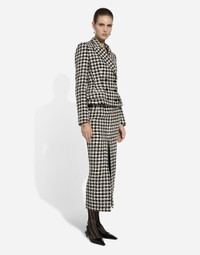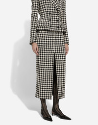 Inspired by 80s fashion photography, the Black Sicily collection masterfully blends masculine and feminine elements, pairing tailored cuts and corset details for the FW 24/25 season. A new vision of the iconic Nero Sicilia black is conveyed through contemporary and sensual looks: jackets and skirts in all-over glen plaid pair with openwork socks, while the 50s-inspired Mun shoes with Eva heel go with the houndstooth Sicily bag featuring crocodile-print leather inserts. Long wool and cotton macro-houndstooth skirt: • White and Black • High-waisted • Central front slit • Stretch silk satin lining • Rear zipper and hook-and-eye fastening • The piece measures 90 cm from the waist down on a size IT 40 • The model is 175 cm tall and wears a size IT 40 • Made in Italy External composition: 65% Virgin Wool 35% Cotton Internal composition: 92% Silk 8% Spandex