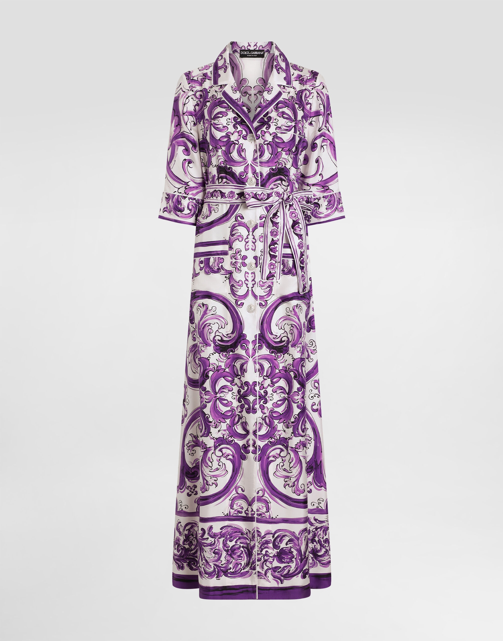 This long printed silk dressing gown is a garment that combines elegance and comfort, ideal for those looking for a sophisticated and distinctive look. Long silk dressing robe with Majolica print: • Multi-coloured • Lapel collar • Elbow-length sleeve with wrist • Single-breasted • Side pockets • Contrasting piping edges • The model is 175 cm tall and wears size 40 IT • Made in Italy The difference in the print placement that you may find on this product is a feature of Dolce&Gabbana’s “Handmade” pieces. A detail that makes every garment or accessory unique and exclusive. External Composition: 100% Silk