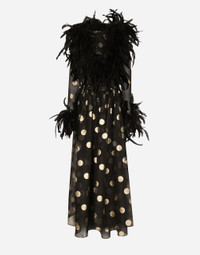 Menswear and womenswear mix and mingle, influencing one another and creating tailoring that embraces endless nuances, from the boldest to the most sophisticated, to define the rules of eternally classy femininity. A monochrome retelling in Nero Sicilia black, embellished by golden touches and rhinestones, adorning clean lines and incorporating stylish fabrics such as velvet, chiffon, lace, organza, and unique mesh details, the expression of authentic beauty for dresses, shirts and accessories. Long polka-dot silk organza dress with rooster feather details: • Black • Feathered round neck • Long sleeves with feathered cuffs • Stretch silk crepe de chine underskirt • Rear zipper and hook-and-bar fastening • The piece measures 116 cm from the waist down on a size IT 40 • The model is 175 cm tall and wears a size IT 40 • Made in Italy External composition: 100% Silk Internal composition: 91% Silk 09% Spandex