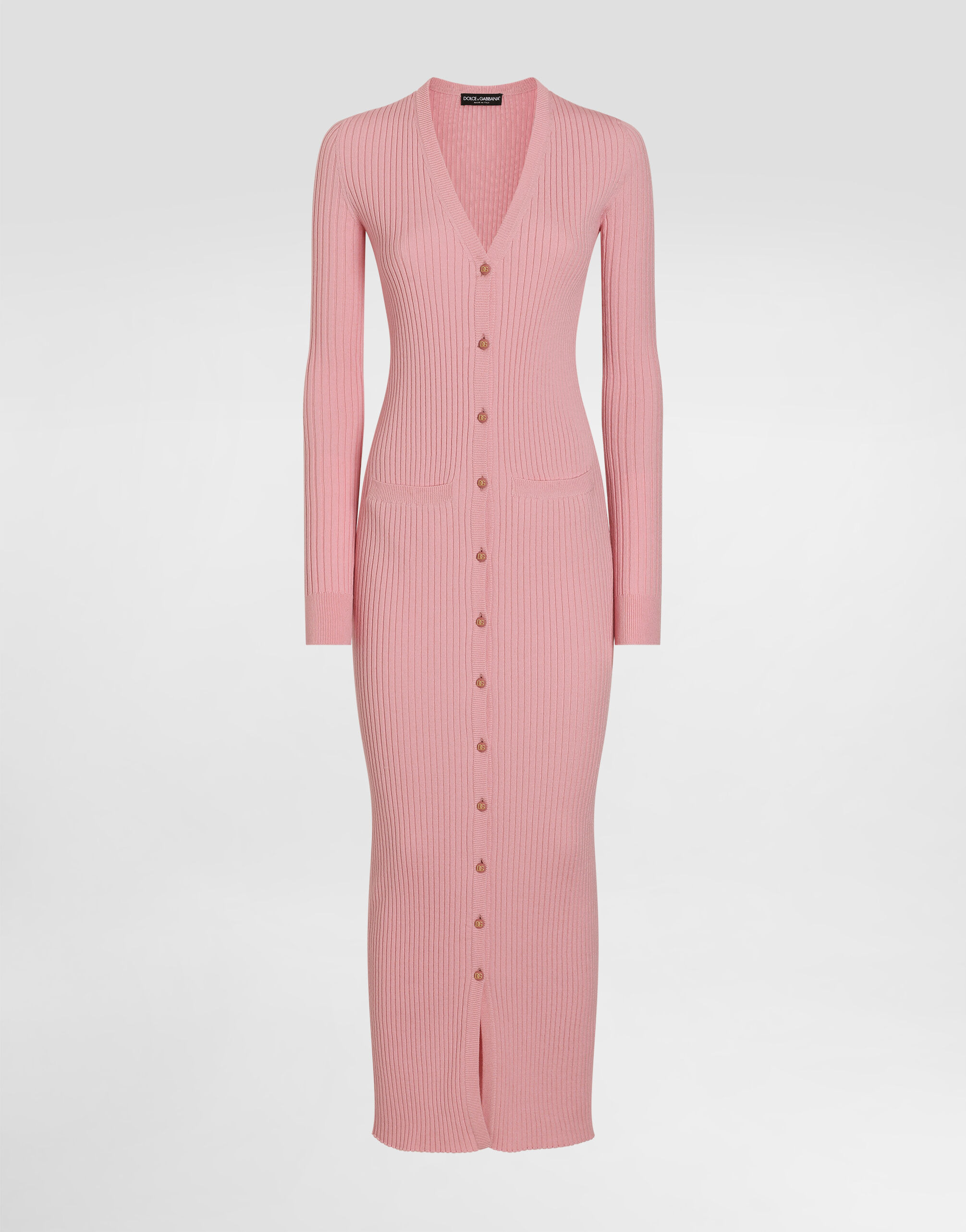 The Women’s DNA Collection is introducing a new side to femininity, which comes in shades of rose quartz, poised between sheerness and opacity, lightness and structure, formality and sensuality. Geometric Dolce Jackets, jacquard pajamas and floral brocade dresses intertwine with ultra-romantic designs. The DG print becomes an iconic statement, while Cordonetto lace and hints of Sicily Black embody the essence of a determined yet romantic femininity. Long ribbed wool cardigan: • Pink • 14-gauge knit • V-neckline • Long sleeves • Pockets • Dense hand • Form fitting • Button fastenings • The piece measures 130 cm from the shoulder seam on a size IT 40 • The model is 175 cm tall and wears a size IT 40 • Made in Italy External composition: 94% Virgin Wool 6% Polyester