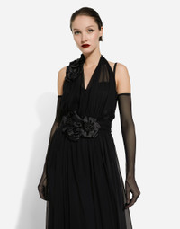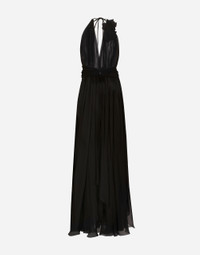 Long silk chiffon dress with floral appliqué: • Black • Silk floral appliqués • Plunging V-neck • Sleeveless • Stretch silk crepe de chine underskirt • Laces on back of neck and short zipper on skirt • The piece measures 118 cm from the waist down on a size IT 40 • The model is 175 cm tall and wears a size IT 40 • Made in Italy Care And Details External composition: 100% Silk Internal composition: 91% Silk 9% Spandex