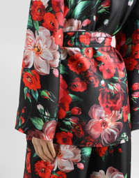 The Spring/Summer 2025 Women’s Collection is celebrating Italian beauty through bold and charismatic femininity. The 50s-inspired lingerie is the star, intermingling with fitted dresses, corsets and oversize trench coats. The iconic jackets have been updated with cropped cuts and modern inserts, while the floral prints add a romantic edge. The eveningwear shines with light fabrics and crystals, accompanied by look-defining accessories, from iconic bags to the cross earrings. Long-sleeved twill pajama shirt with rose print: • Multi-colored • Notched lapel collar • Long sleeves • Patch pockets • Regular fit • Button fastenings with branded bottom edge and silk twill belt • The piece measures 75 cm from the back of the neck on a size IT 40 • The model is 175 cm tall and wears a size IT 40 • Made in Italy The difference in the print placement that you may find on this product is a feature of Dolce&Gabbana’s “Handmade” pieces. A detail that makes every garment or accessory unique and exclusive. External composition: 100% Silk