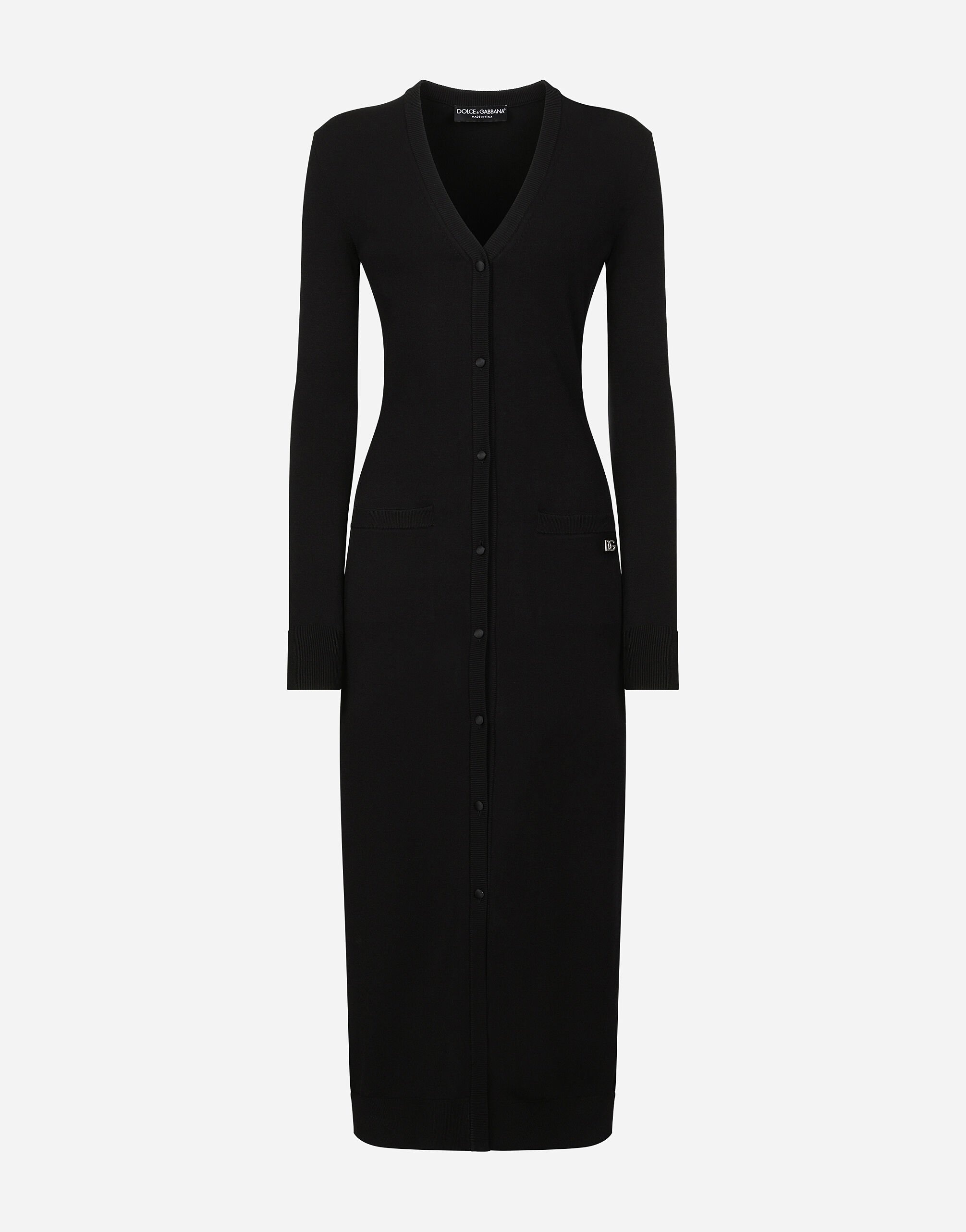 Inspired by 80s fashion photography, the Black Sicily collection masterfully blends masculine and feminine elements, pairing tailored cuts and corset details for the FW 24/25 season. A new vision of the iconic Nero Sicilia black is conveyed through contemporary and sensual looks: jackets and skirts in all-over glen plaid pair with openwork socks, while the 50s-inspired Mun shoes with Eva heel go with the houndstooth Sicily bag featuring crocodile-print leather inserts. Long stretch viscose knit cardigan with DG logo: • Black • V-neck • 14-gauge knit • Long sleeves • French seam armholes • Dense hand • Button fastenings • The piece measures 125 cm from the shoulder seam on a size IT 40 • The model is 175 cm tall and wears a size IT 40 • Made in Italy External composition: 71% Viscose 15% Polyester 8% Polyamide 6% Spandex