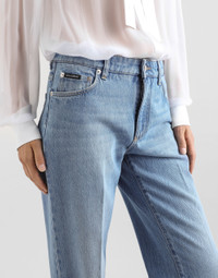 Dolce&Gabbana is conveying a new way of interpreting denim and does so by drawing inspiration from key words such as glamor and signature aesthetic, creating a collection that is perfect for every style and personality, merging femininity, modernity and originality. Loose cotton denim jeans with pressed pleat: • Blue • Low rise • 5 pockets • Branded label on the coin pocket • Branded metal and leather tag on the back pocket • Inner leg: 86 cm • Hem: 23 cm • Zipper and branded metal button fastening • The model is 175 cm tall and wears a size IT 40 • Made in Italy External composition: 100% Cotton