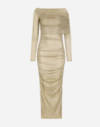Lurex mesh calf-length skirt: • Gold • Straight neck with draping on shoulders • Long sleeves • Unlined • Zipper fastening on the side • The piece measures 90 cm from the waist down on a size IT 40 • The model is 175 cm tall and wears a size IT 40 • Made in Italy Care And Details External composition: 70% Viscose 30% Polyester