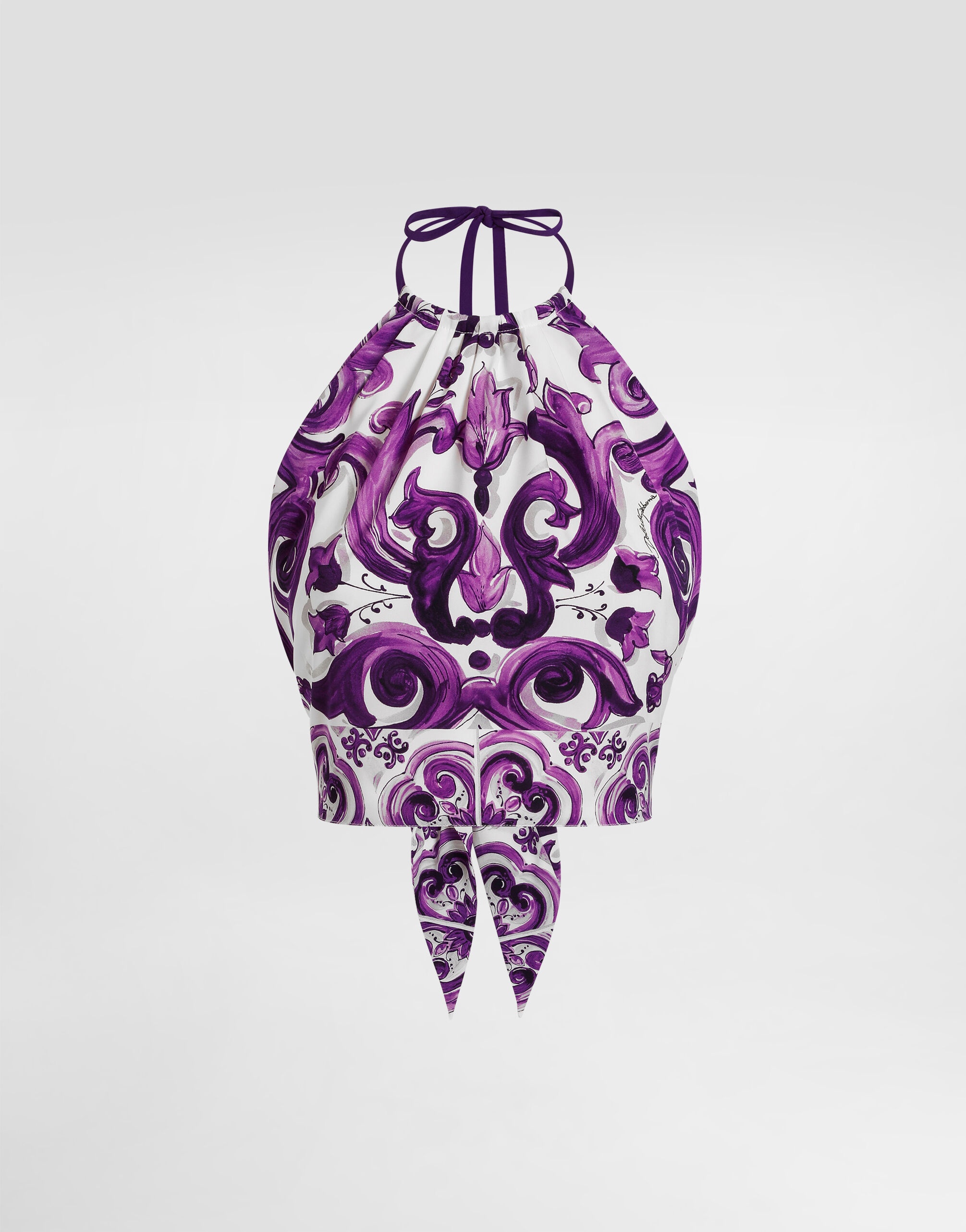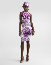 This printed top is a versatile and chic garment, ideal for those who love sophisticated and refined style. Perfect for a summer evening or a special event, its unique design catches the eye with elegance. Elastic charmeuse top with Majolica print: • Multi-coloured • Halter neck top • Knotted scarf effect on the back • Contrasting neckline strap • Lined front, back doubled • The model is 175 cm tall and wears size 40 IT • Made in Italy The difference in the print placement that you may find on this product is a feature of Dolce&Gabbana’s “Handmade” pieces. A detail that makes every garment or accessory unique and exclusive. External Composition: 94% Silk, 6% ElastaneInternal Composition: 91% Silk, 9% Elastane