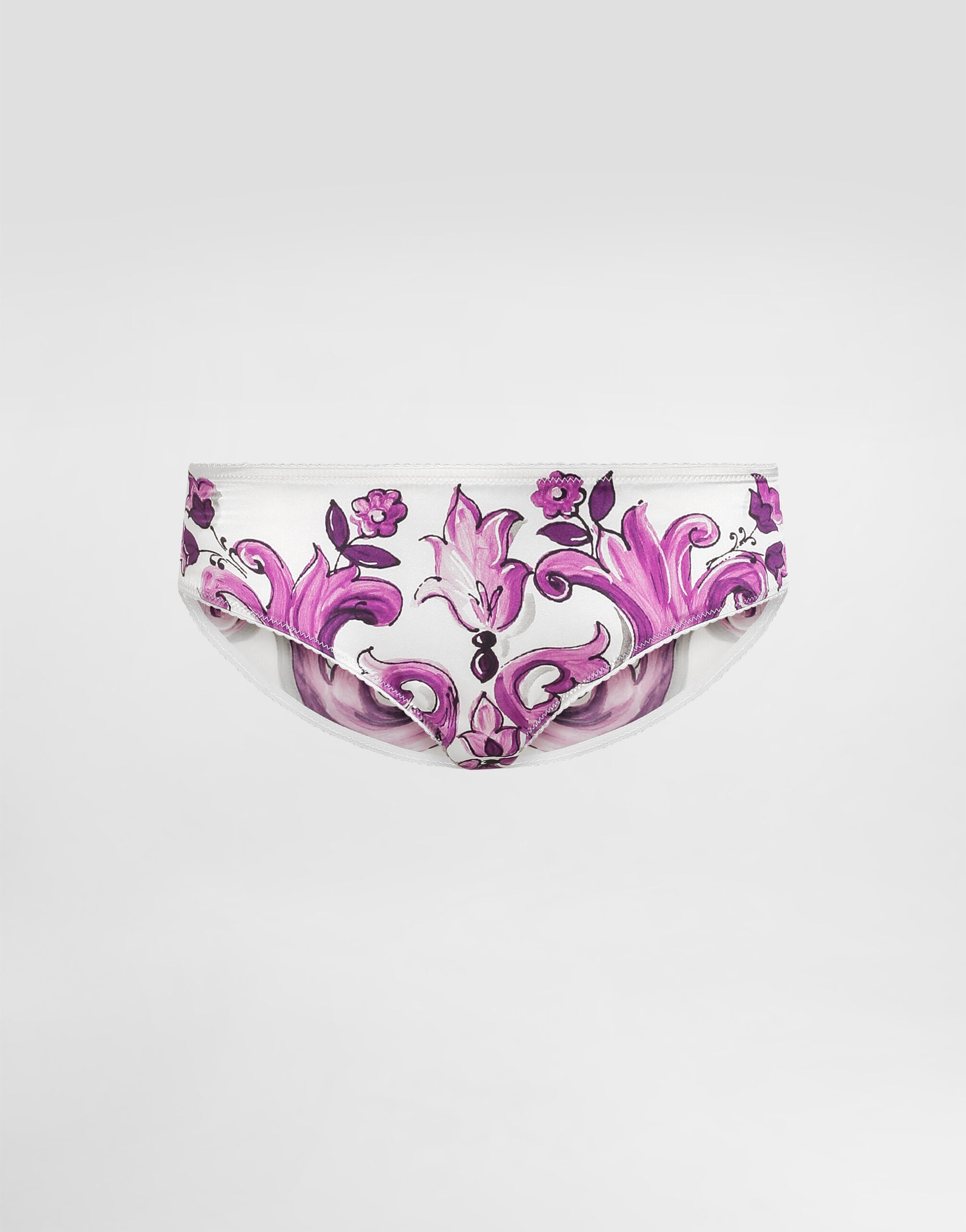 This purple Majolica stretch satin brief is a perfect choice for those looking for a touch of elegance and comfort in their underwear. Majolica-print stretch satin briefs: • Purple • Low-waisted briefs, with cap elastic at the waist and legs • Made in Italy The difference in the print placement that you may find on this product is a feature of Dolce&Gabbana’s “Handmade” pieces. A detail that makes every garment or accessory unique and exclusive. Given the product characteristics, some items in the Underwear category cannot be returned. For more information, see the Returns and Refunds section. External Composition: 93% Silk, 7% Elastane