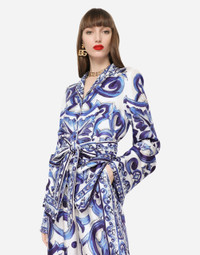 • Notched lapel collar • Long sleeves • Patch pockets • Regular fit • Button fastenings with branded bottom edge and silk twill belt • The piece measures 75 cm from the rear seam on a size IT 40 • The model is 175 cm tall and wears a size IT 40 • Made in Italy Care And Details External composition: 100% Silk
