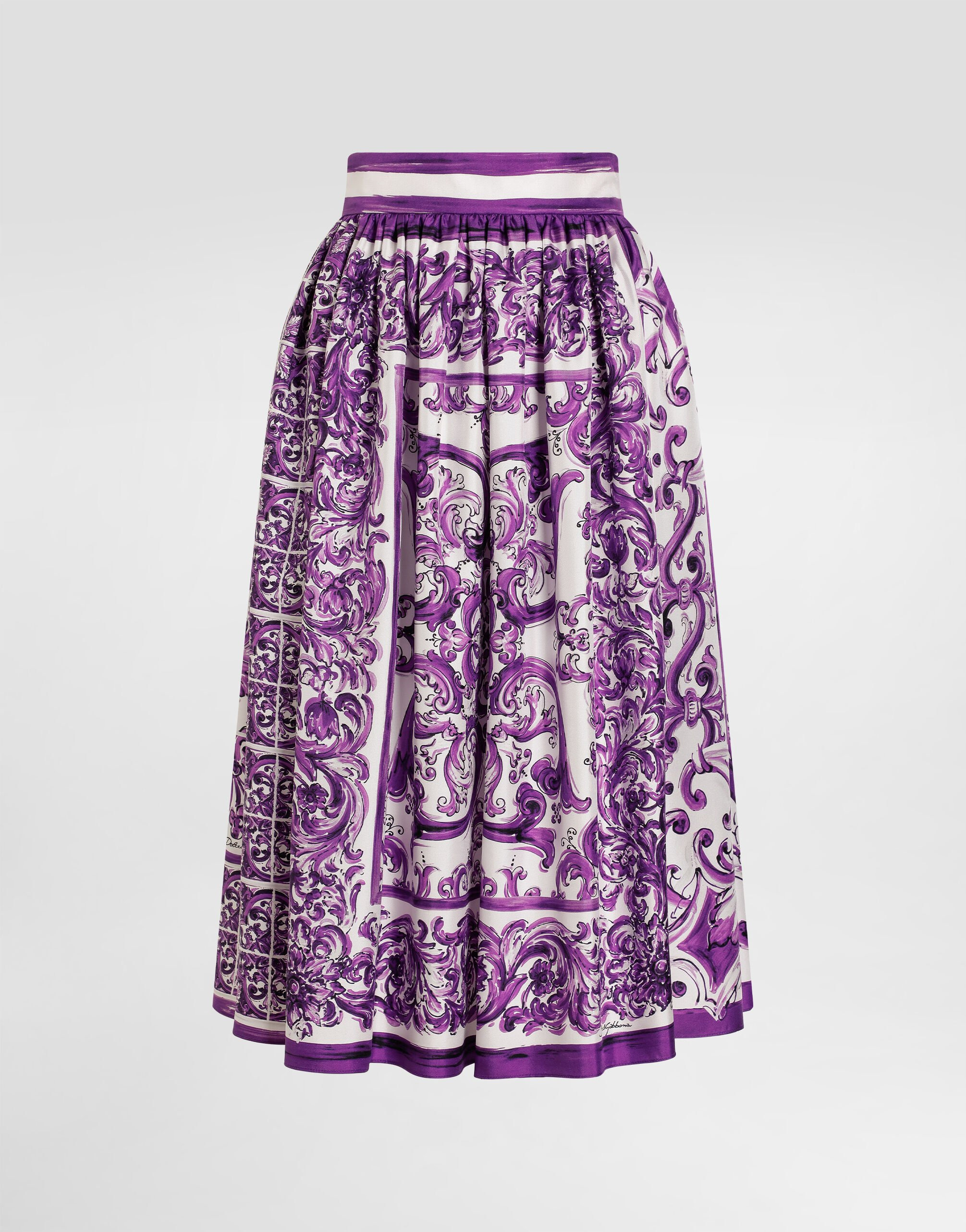 This silk twill skirt with Majolica print is an example of craftsmanship and refined design, perfect for those looking for a unique and distinctive garment. Gathered twill skirt with Majolica print: • Multi-coloured • Side pockets • Finished belt 5 cm high • Opening at the back with covered zip • The model is 175 cm tall and wears size 40 IT • Made in Italy The difference in the print placement that you may find on this product is a feature of Dolce&Gabbana’s “Handmade” pieces. A detail that makes every garment or accessory unique and exclusive. External Composition: 100% Silk