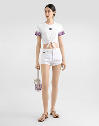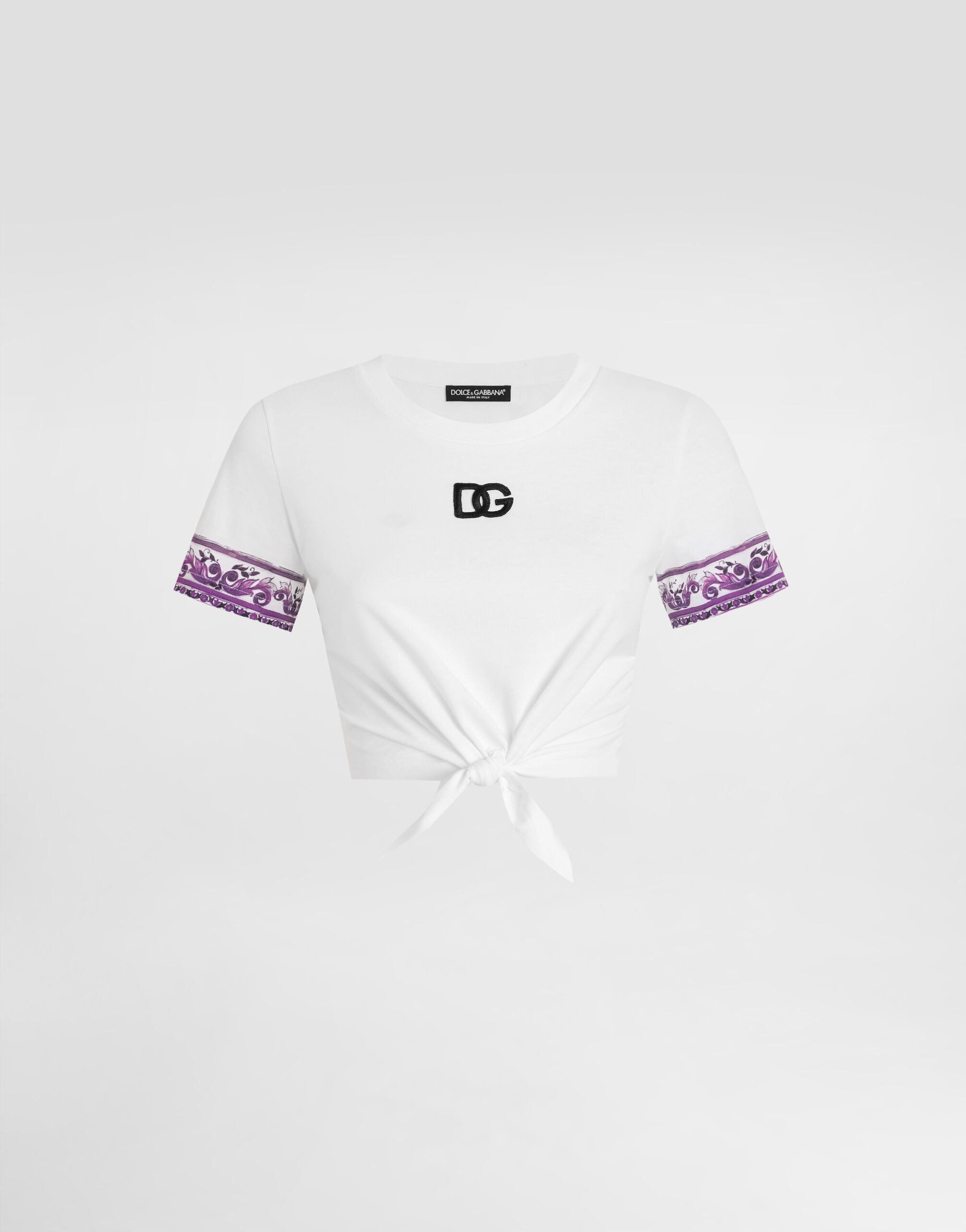 This cotton t-shirt with Majolica print is perfect for adding a touch of color and style to your wardrobe. With a versatile and refined design, it is ideal for any occasion, from casual to the most elegant. Short-sleeved t-shirt with Majolica print: • Multi-coloured • Crew neck • Bow on front • DG embroidery print sleeves on the front • The model is 175 cm tall and wears size 40 IT • Made in Italy The difference in the print placement that you may find on this product is a feature of Dolce&Gabbana’s “Handmade” pieces. A detail that makes every garment or accessory unique and exclusive. External Composition: 100% Cotton