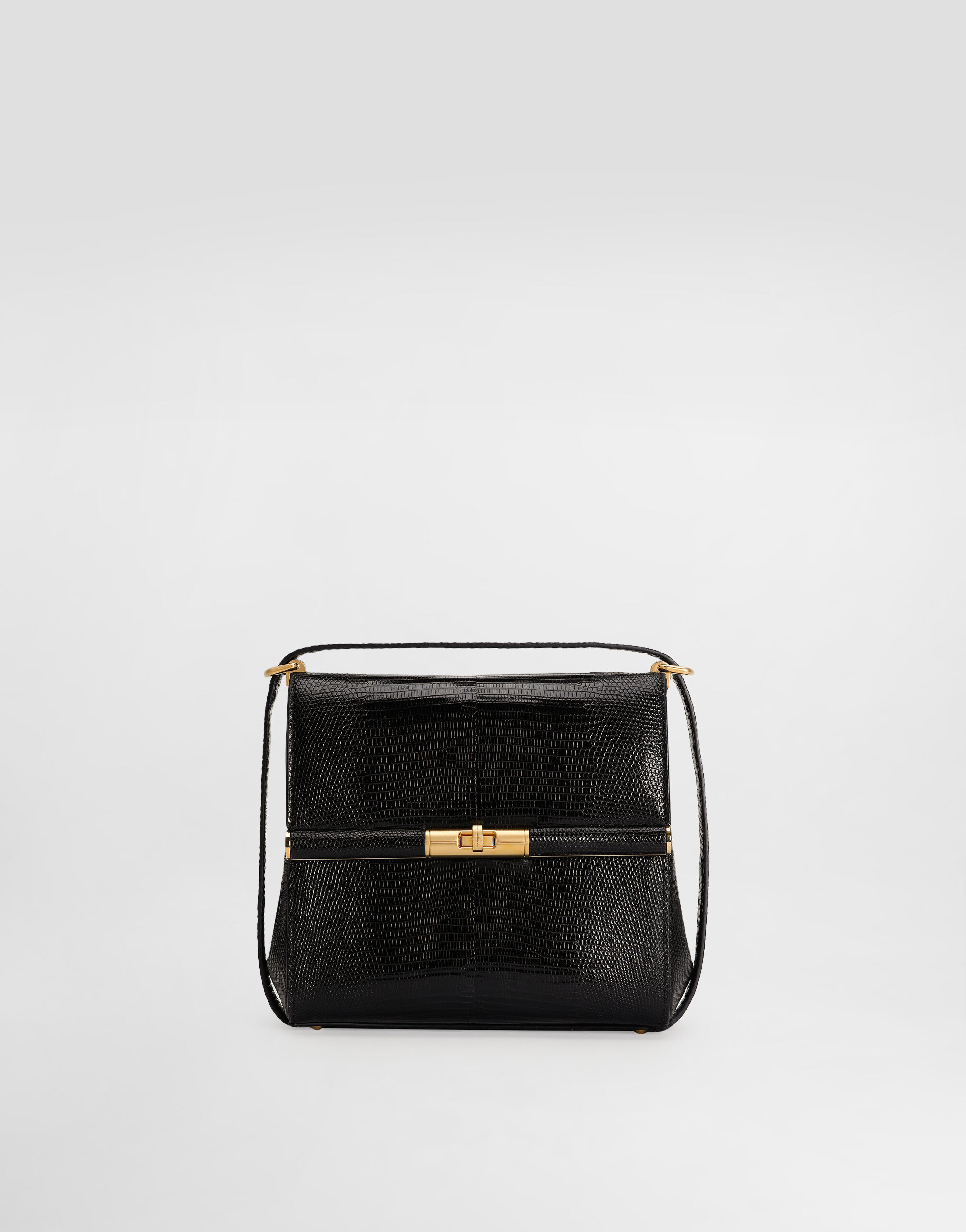 Iconic and timeless, this Marlene bag comes in lizard skin. Marlene lizard skin crossbody bag: • Black • Front flap with branded turn-lock fastening • Adjustable lizard leather strap • Nappa leather lining with zipped pocket and flat pocket • Item comes with a branded dust bag • Measurements: H18 x W16 x D8 cm • Made in Italy External composition: 100% Monitor Lizard Internal composition: 100% Lambskin
