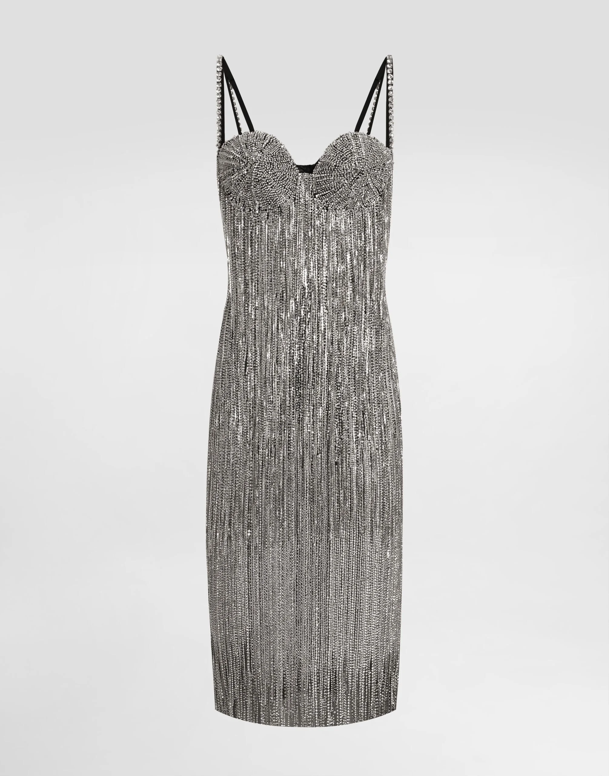 The Spring/Summer 2025 Women’s Collection is celebrating Italian beauty through bold and charismatic femininity. The 50s-inspired lingerie is the star, intermingling with fitted dresses, corsets and oversize trench coats. The iconic jackets have been updated with cropped cuts and modern inserts, while the floral prints add a romantic edge. The eveningwear shines with light fabrics and crystals, accompanied by look-defining accessories, from iconic bags to the cross earrings. Marquisette calf-length dress with sequined fringing: • Silver • Sweetheart neck with conical cups and bra • Sleeveless with shoulder straps • Stretch tulle lining • Rear zipper and hook-and-eye fastening • The piece measures 72 cm from the waist down on a size IT 40 • The model is 175 cm tall and wears a size IT 40 • Made in Italy External composition: 90% Polyester 9% Silk 1% Spandex Internal composition: 90% Polyamide 9% Silk 1% Spandex