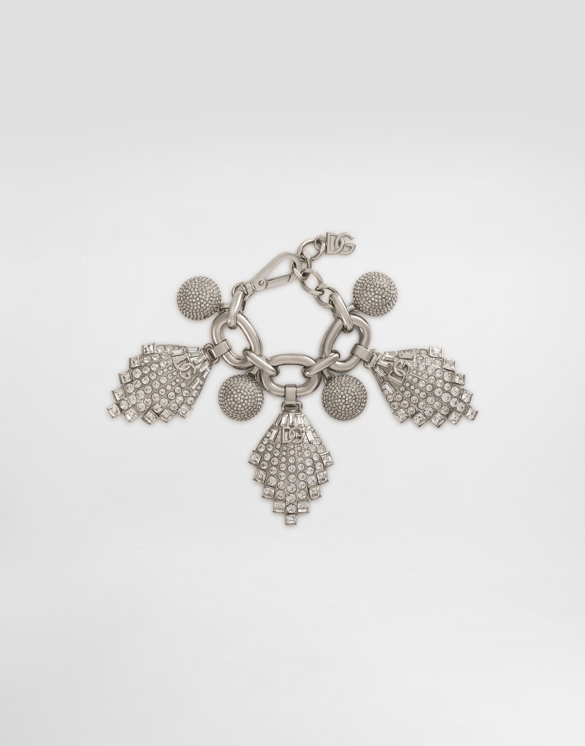 The Everyday Women's Collection reimagines contemporary daily wear with Dolce&Gabbana's signature style codes. Iconic fabrics mix with standout details like embroidered flowers, crystals, and jewel buttons, infusing elegance into every look. Gray animal print accented with green and purple, hyper-geometric jewelry, voluminous shapes and transparencies add unique touches. Men's tweed is reinvented with graphic twists, creating distinctive pieces that reflect refined sensuality. Maxi-bracelet with chain, rhinestones accents and the DG logo: • Palladium • Length: 17 + 5 cm • Clasp fastening • Nickel-free and hypoallergenic materials • Engraved logo • Made in Italy Composition: 70% Brass 25% Glass 5% Zamak