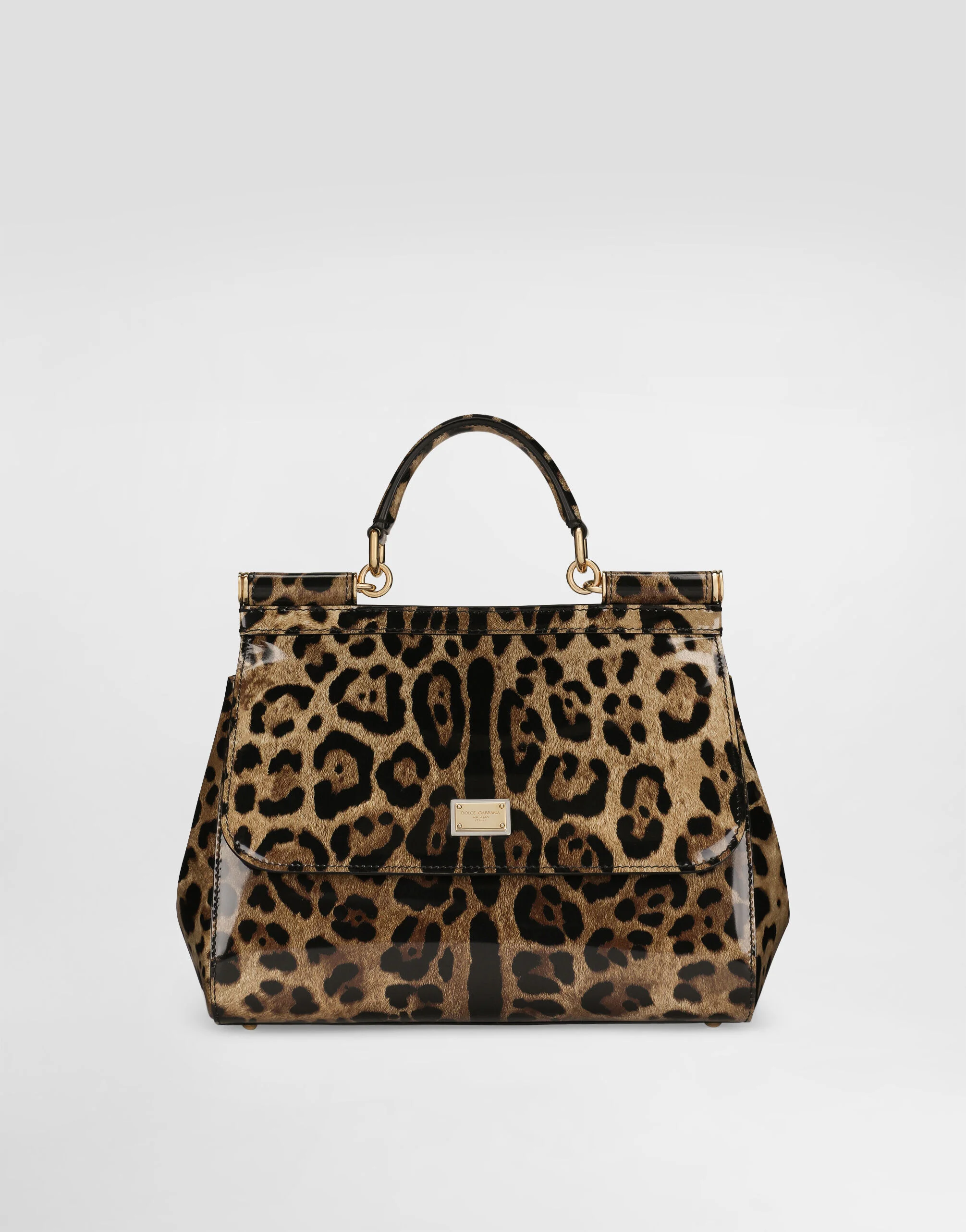 Medium Sicily bag in leopard-print polished calfskin with light gold-plated metal logo tag: • Front flap with hidden double magnetic fastening • Branded tag • Top handle and adjustable, detachable strap in leopard-print polished calfskin • Calfskin lining • Inner pocket with branded zipper , card compartment and a cell phone holder • Metal feet studs on the base • Item comes with a branded dust bag • Measurements: 21 x 26 x 12 cm • Made in Italy Care And Details External composition: 100% Calfskin Internal composition: 95% Calfskin 5% Viscose