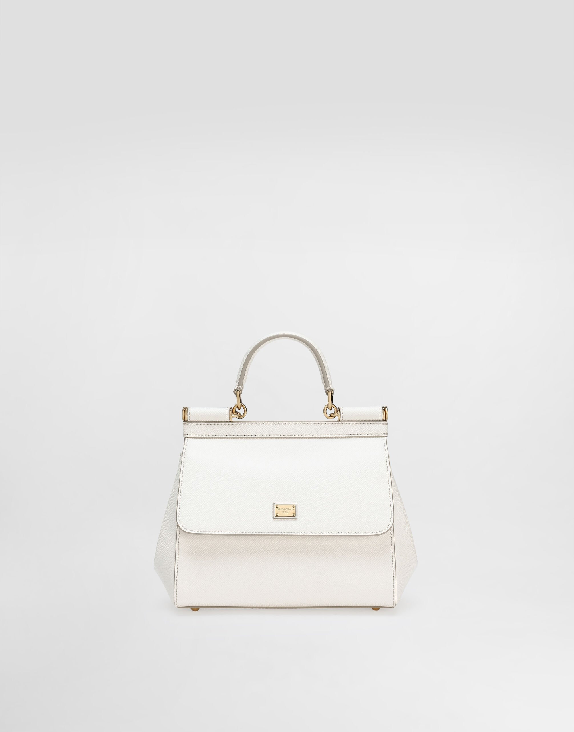 The brand icon par excellence this medium Sicily bag comes in Dauphine calfskin. Understated and feminine it comes with the logo tag featuring two metal plating finishes. Medium Sicily bag in Dauphine calfskin: • White • Front flap with hidden double magnetic fastening • Logo tag featuring two metal plating finishes • Top handle and adjustable, detachable strap in Dauphine calfskin • Printed fabric lining • Inner pocket with branded zipper and a cell phone holder • Metal feet studs on the base • Item comes with a branded dust bag • Measurements: H18.5 x W20 x D10 cm • Made in Italy External Composition: 100% Calfskin Internal Composition: 90% Cotton 10% Calfskin